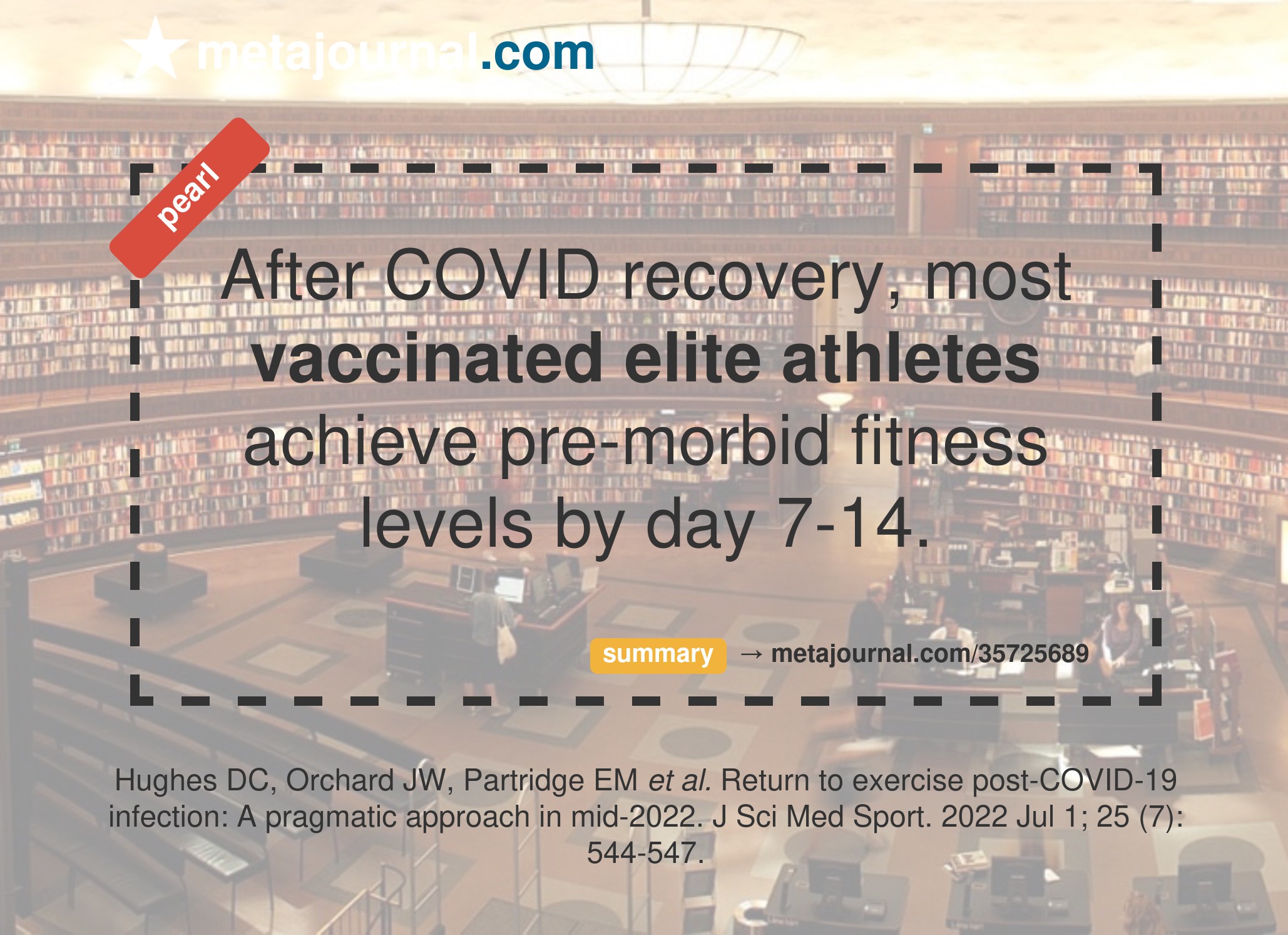 The author's experience has been that most vaccinated elite athletes achieve pre-morbid fitness levels after COVID recovery by day 7-14. Recreational athletes are recommended to pursue a more conservative course, but nonetheless they suggest: