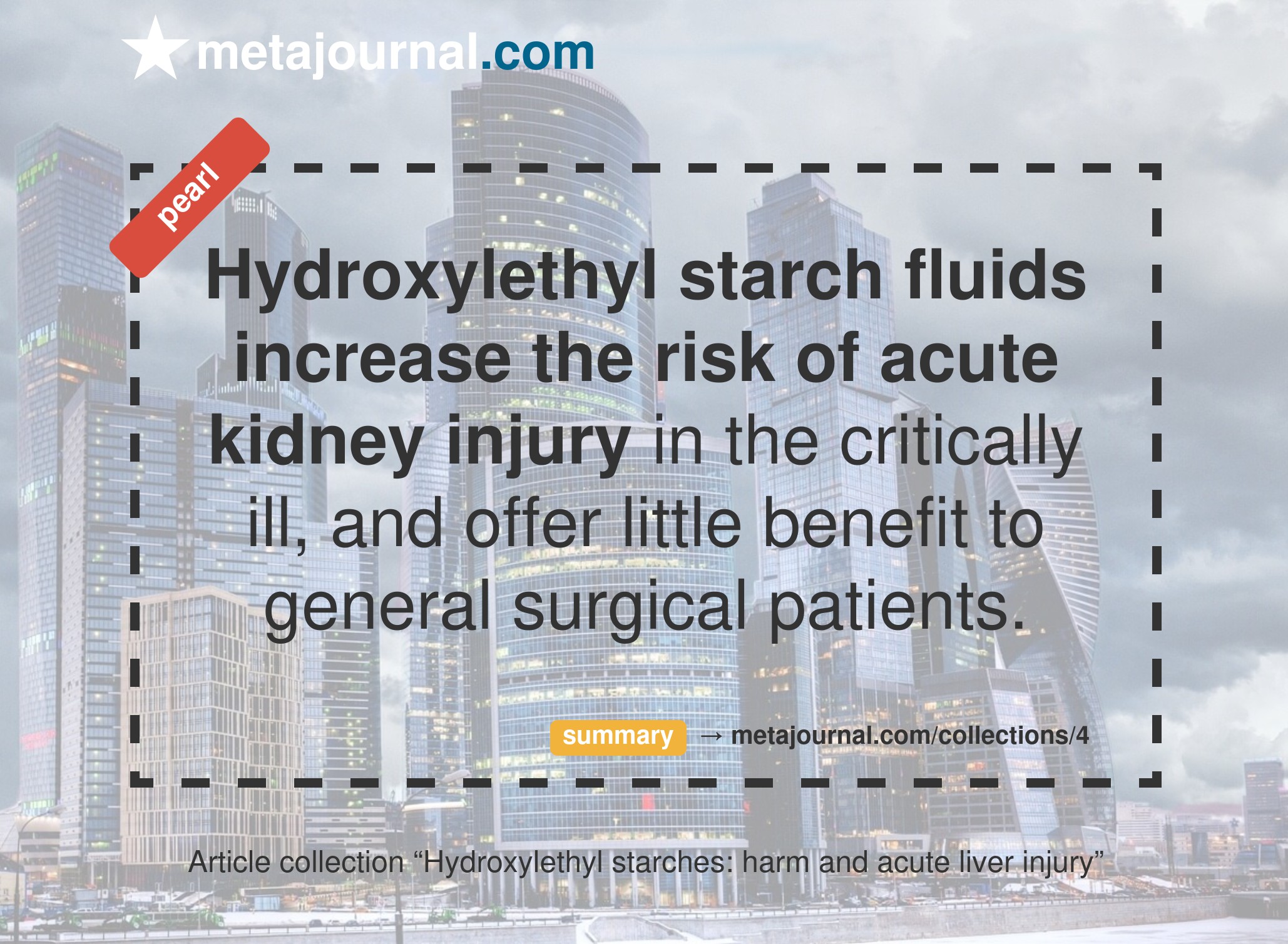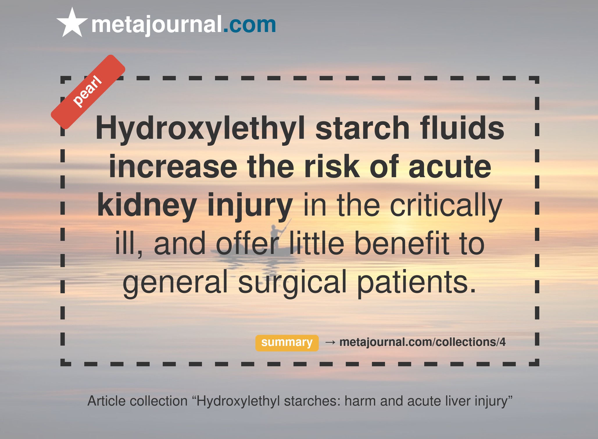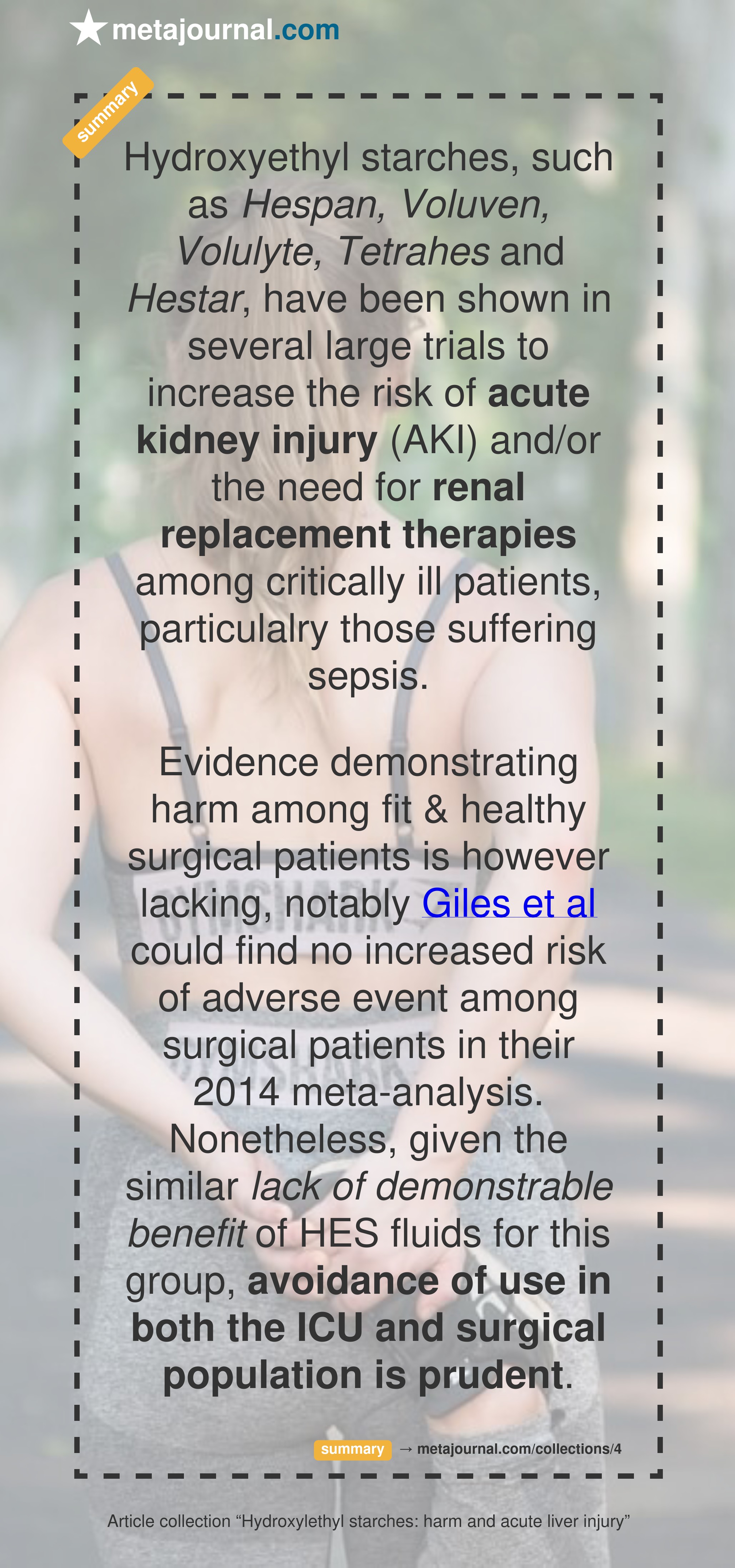 Evidence demonstrating harm among fit & healthy surgical patients is however lacking, notably Giles et al could find no increased risk of adverse event among surgical patients in their 2014 meta-analysis. Nonetheless, given the similar lack of demonstrable benefit of HES fluids for this group, avoidance of use in both the ICU and surgical population is prudent.