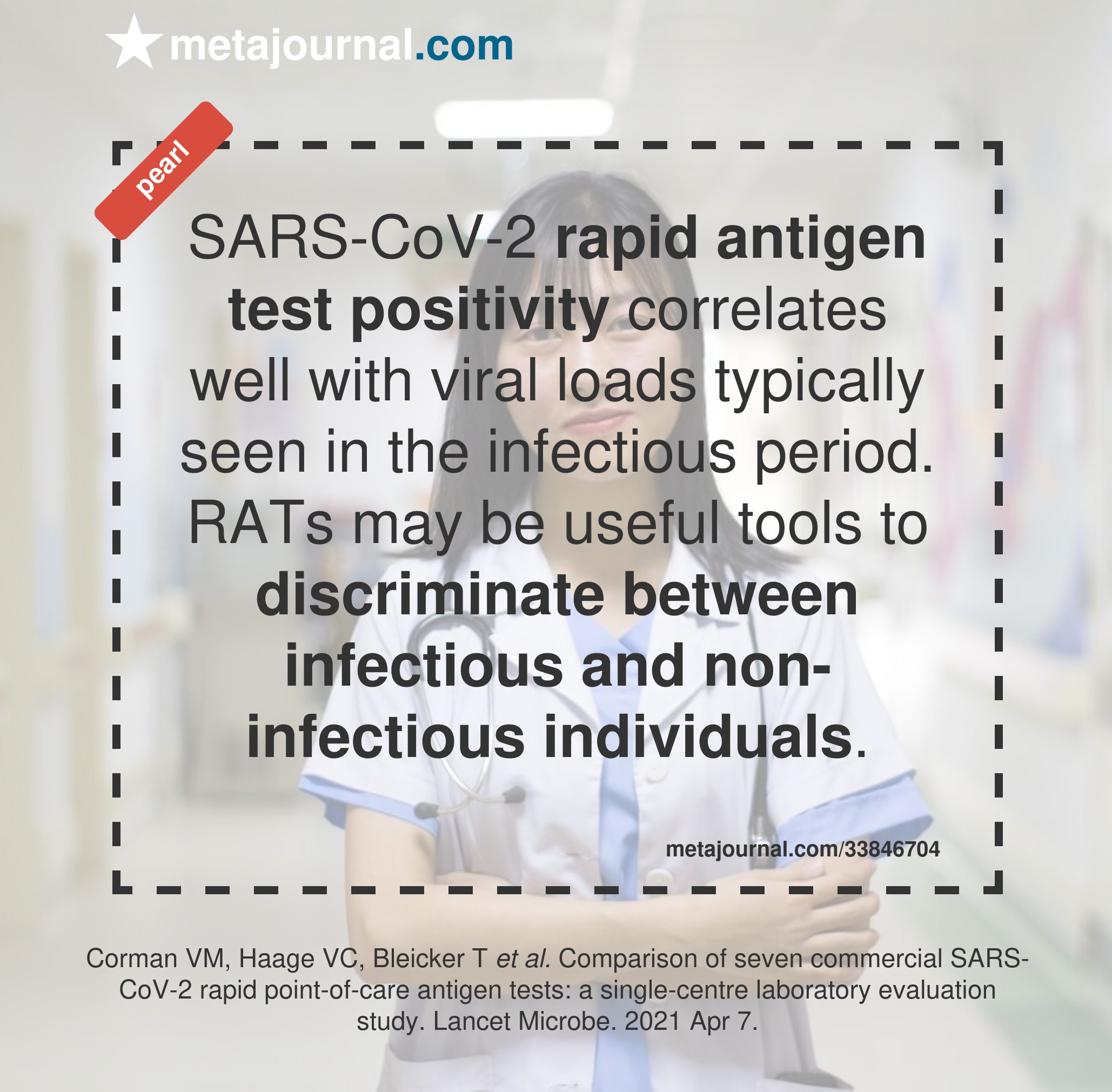 An adequately-validated RAT, when correctly performed, is likely a sensitive indictor of individual infectiousness at that specific moment in time. The reliability of a negative RAT will be improved if using the same manufacturer and technique as a RAT previously positive test, and more so if there are several subsequent negative RATs.