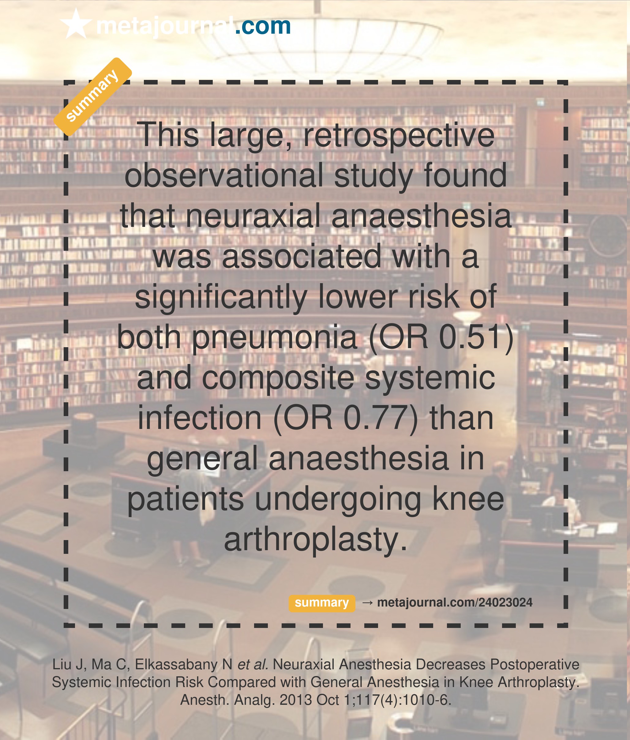 This large, retrospective observational study found that neuraxial anaesthesia was associated with a significantly lower risk of both pneumonia (OR 0.51) and composite systemic infection (OR 0.77) than general anaesthesia in patients undergoing knee arthroplasty.