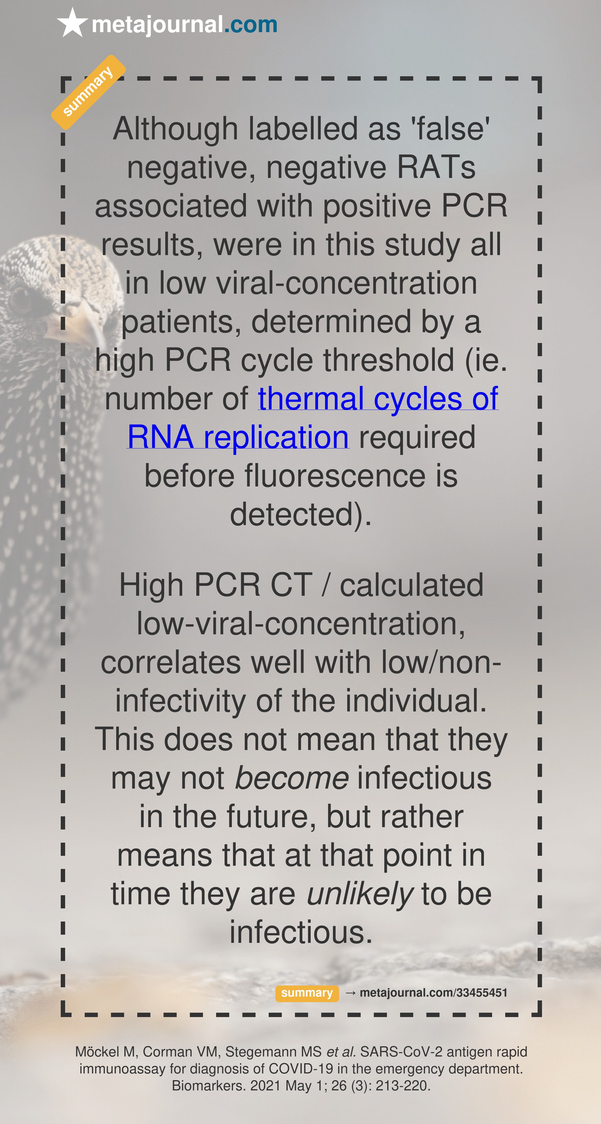 Although labelled as 'false' negative, negative RATs associated with positive PCR results, were in this study all in low viral-concentration patients, determined by a high PCR cycle threshold (ie. number of thermal cycles of RNA replication required before fluorescence is detected).