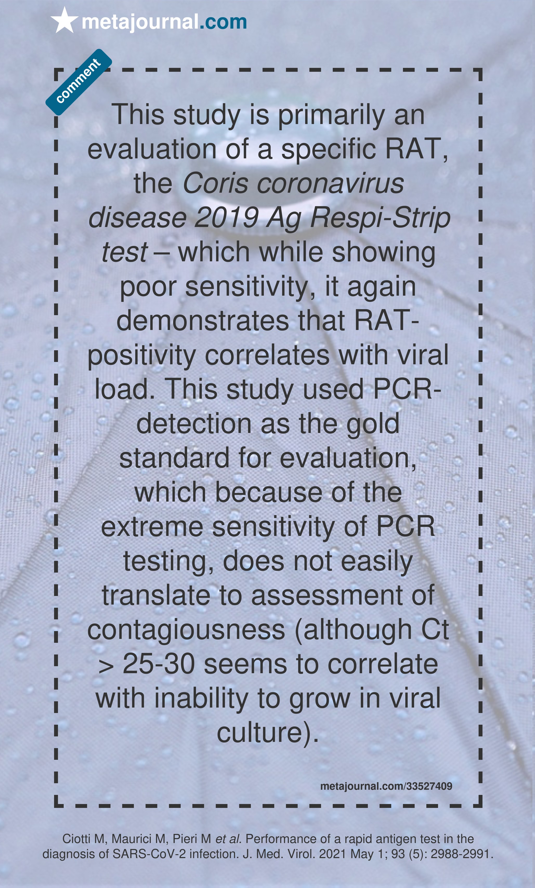 This study is primarily an evaluation of a specific RAT, the Coris coronavirus disease 2019 Ag Respi-Strip test – which while showing poor sensitivity, it again demonstrates that RAT-positivity correlates with viral load. This study used PCR-detection as the gold standard for evaluation, which because of the extreme sensitivity of PCR testing, does not easily translate to assessment of contagiousness (although Ct > 25-30 seems to correlate with inability to grow in viral culture).