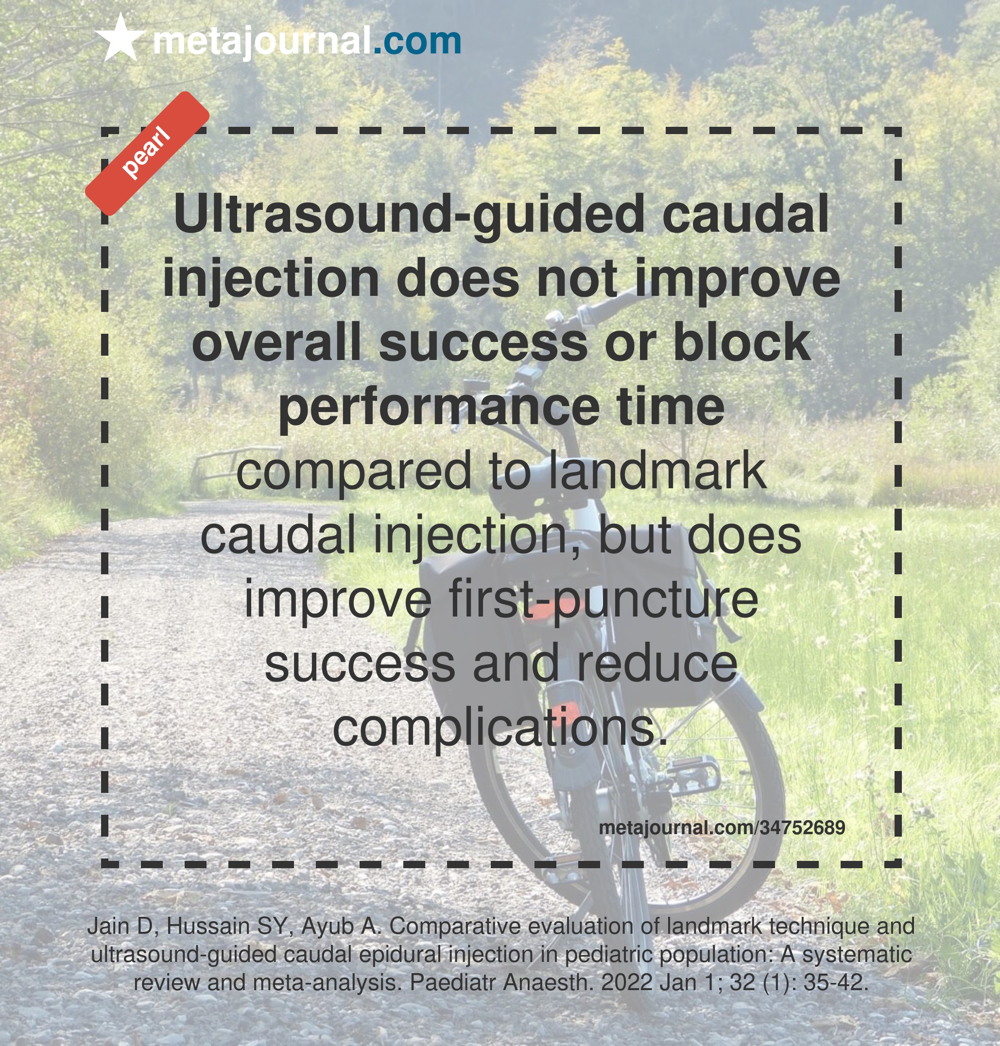 Ultrasound-guided caudal injection does not improve overall success or block performance time compared to landmark caudal injection, but does improve first-puncture success and reduce complications.