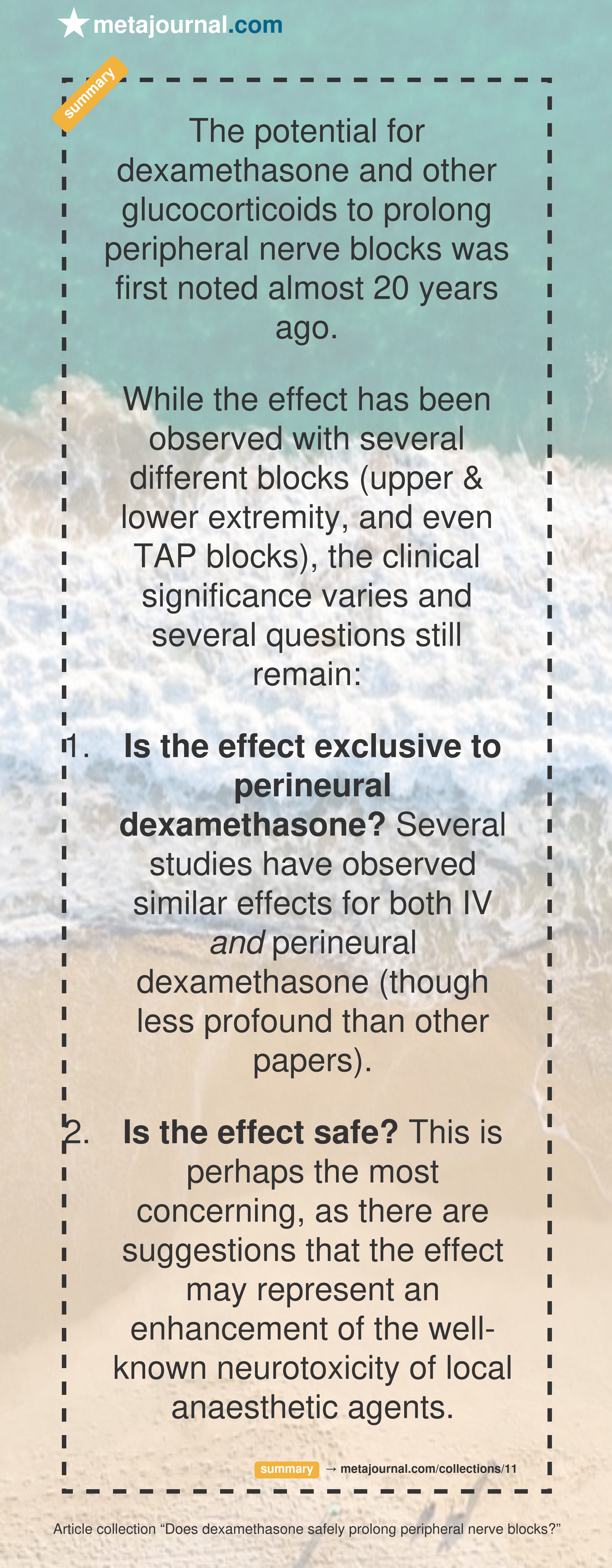 A cautionary summary of the benefits and potential risks of perineural dexamethasone.