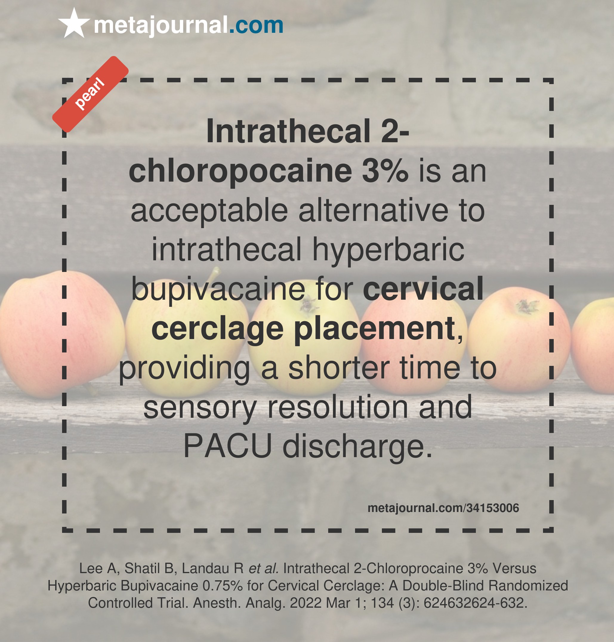 Intrathecal 2-chloropocaine 3% is an acceptable alternative to intrathecal hyperbaric bupivacaine for cervical cerclage placement, providing a shorter time to sensory resolution and PACU discharge.