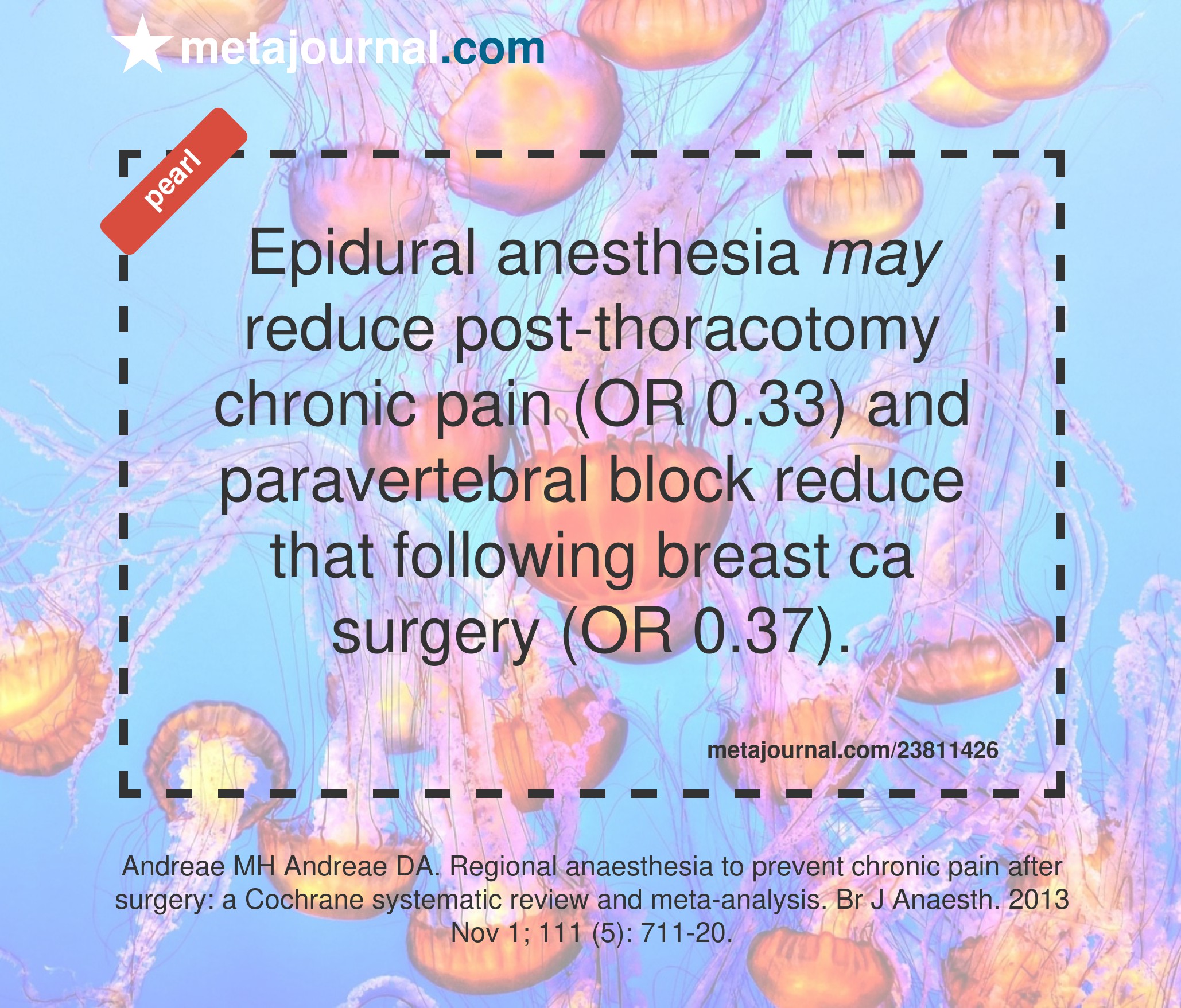 Although this Cochrane review supports the belief that epidural and paravertebral blocks may reduce persistent-surgical pain after thoracotomy or breast cancer surgery respectively, the authors highlight the low total number of subjects (only 339 patients) in the five trials analysed. This is enough evidence to consider the PSP-benefits of regional anesthesia, but far from enough to be conclusive or change practice.