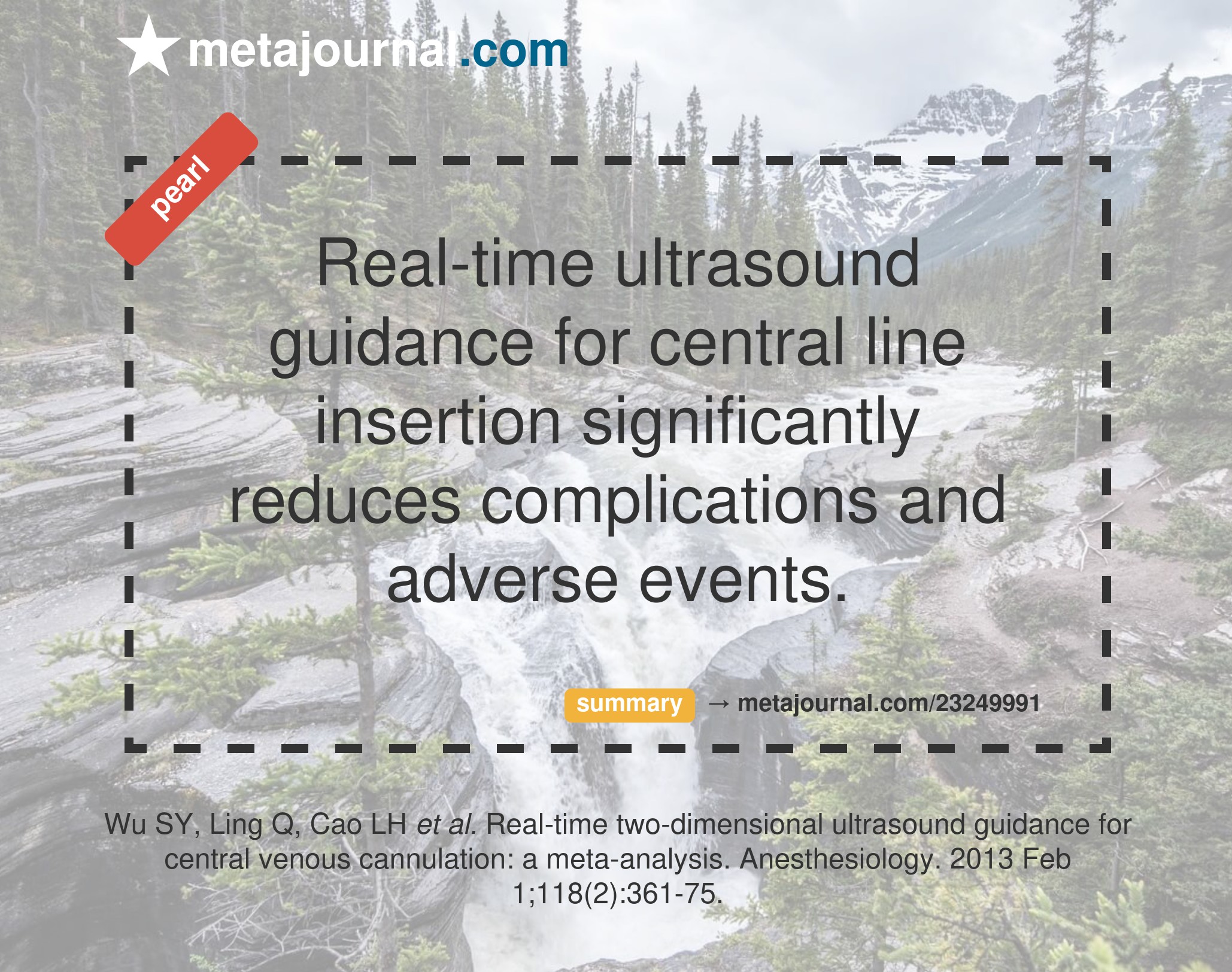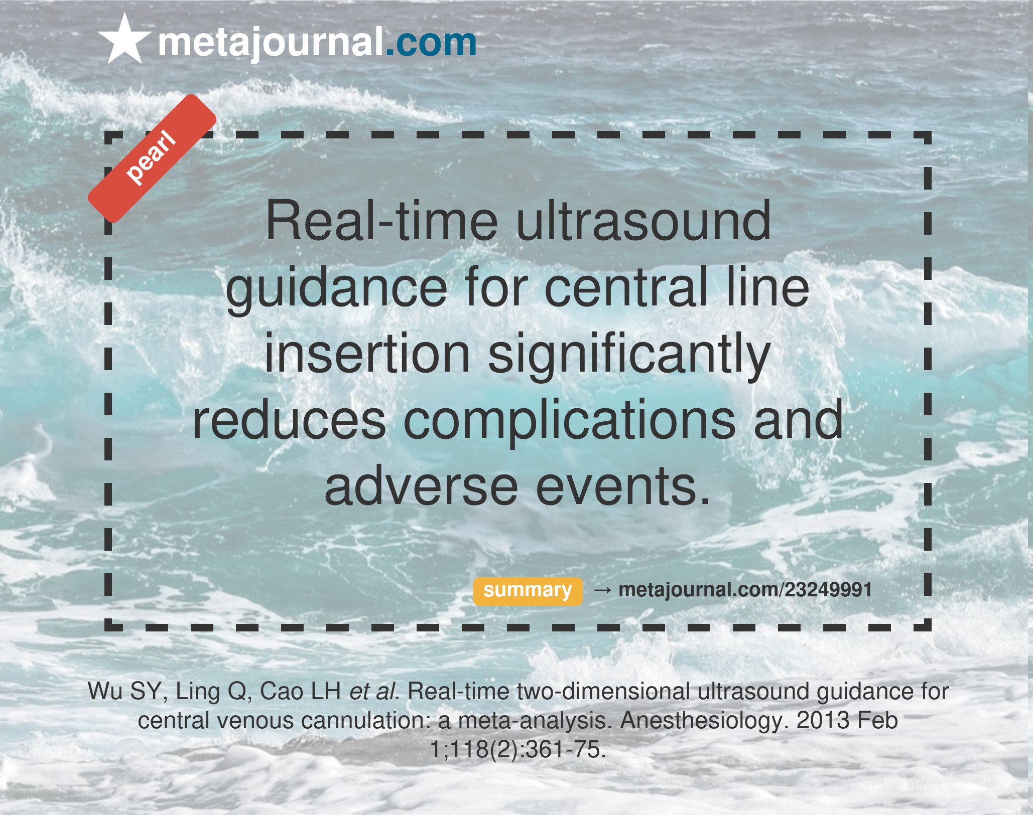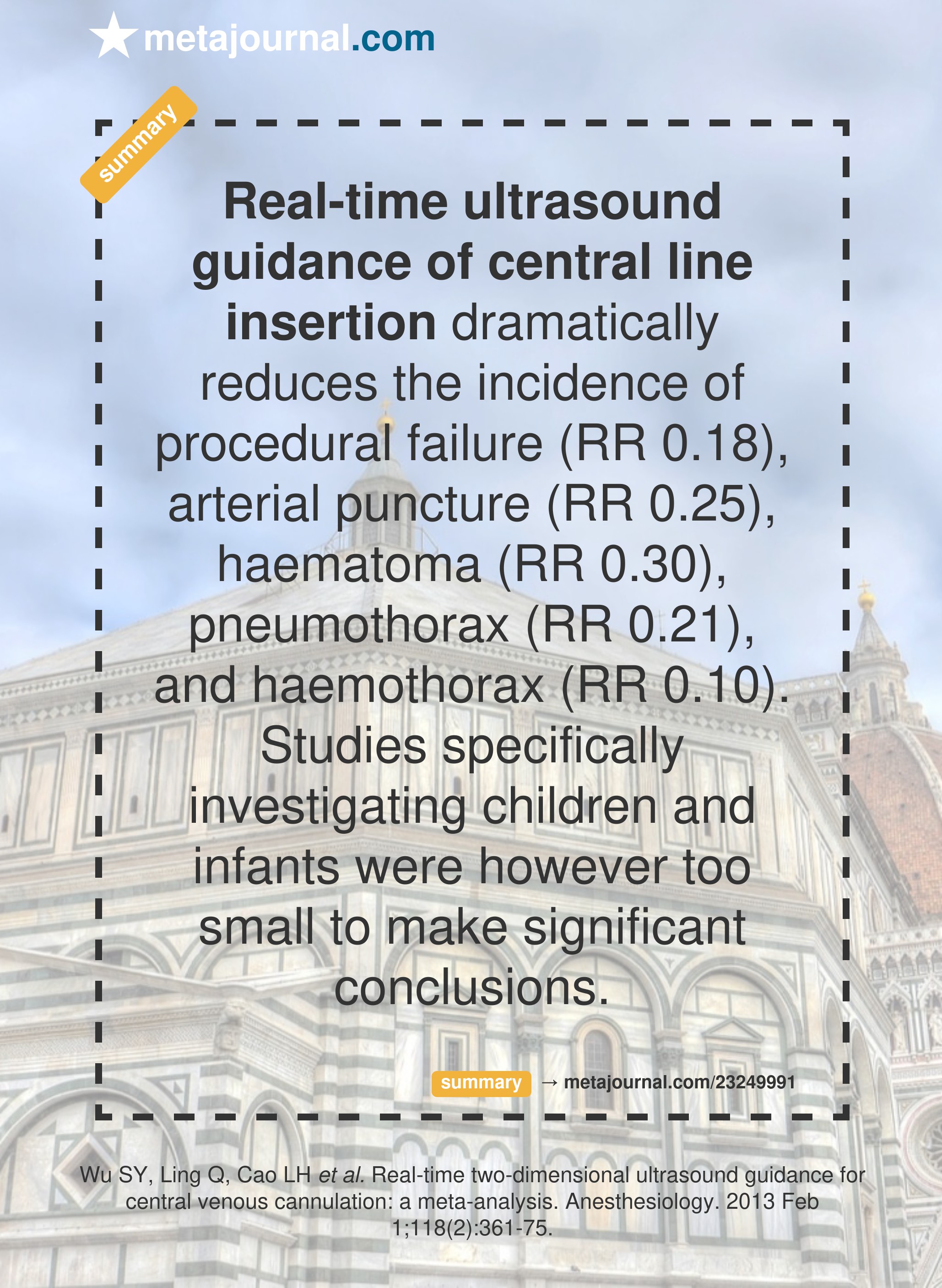Real-time ultrasound guidance of central line insertion dramatically reduces the incidence of procedural failure (RR 0.18), arterial puncture (RR 0.25), haematoma (RR 0.30), pneumothorax (RR 0.21), and haemothorax (RR 0.10). Studies specifically investigating children and infants were however too small to make significant conclusions.