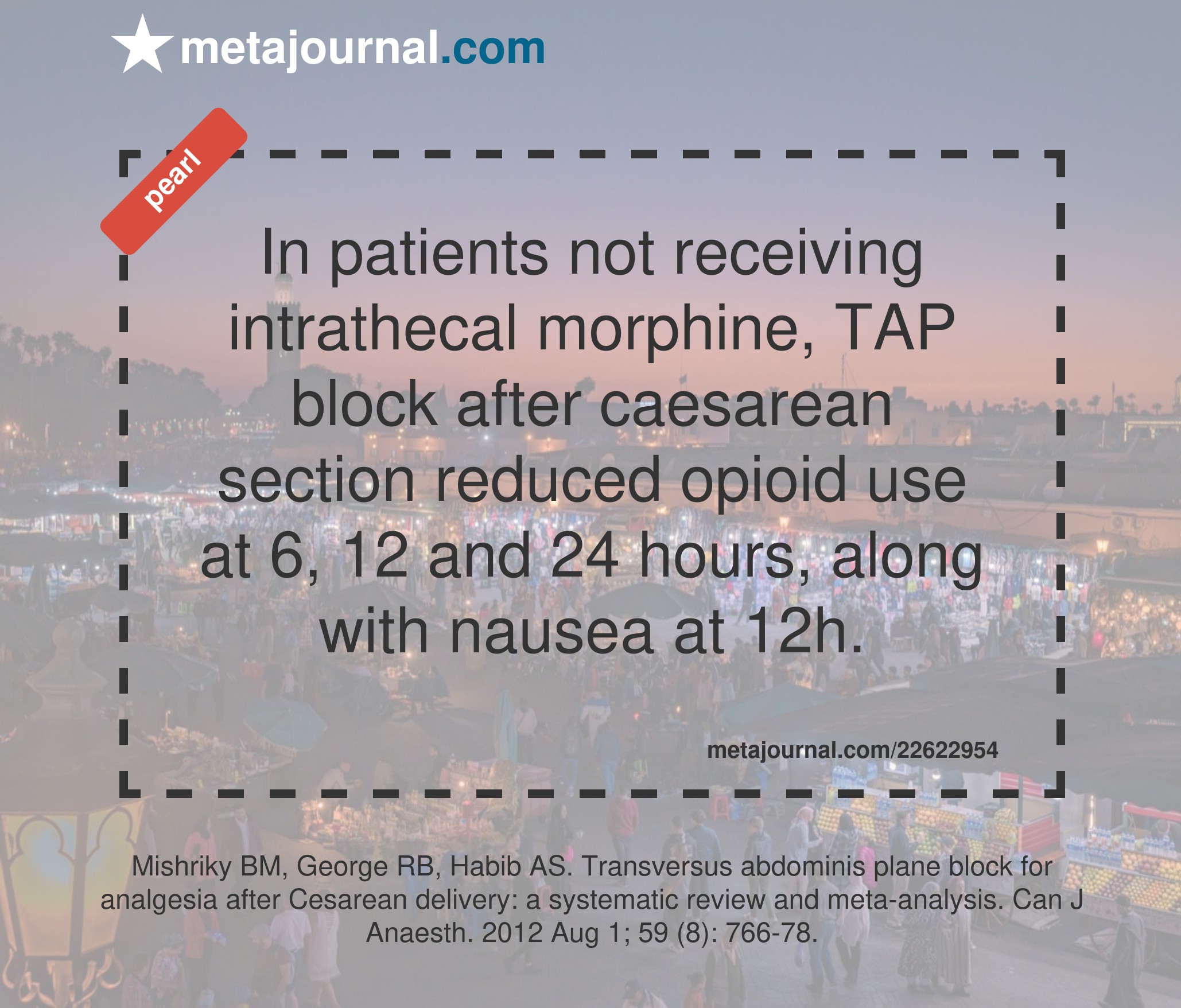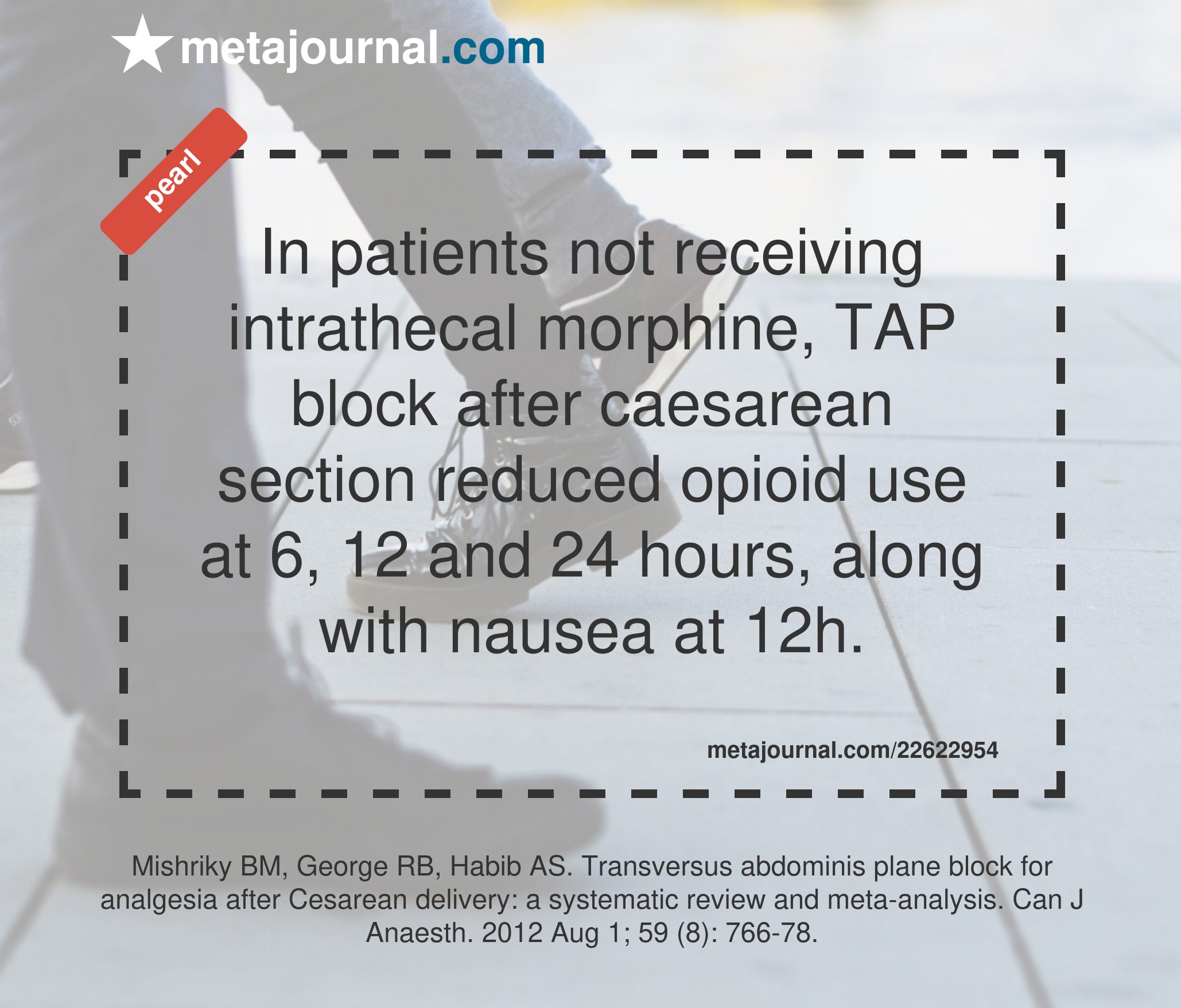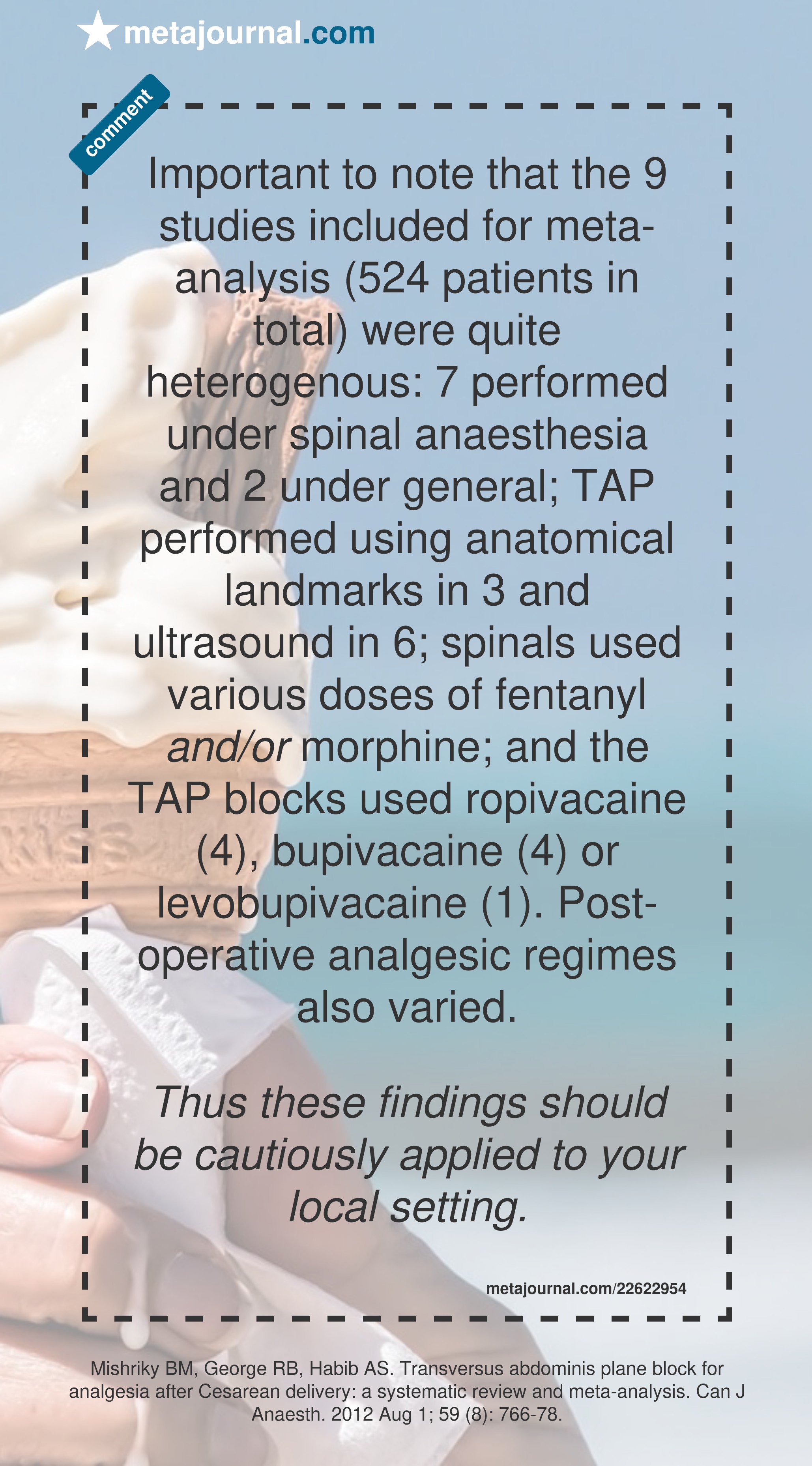 Important to note that the 9 studies included for meta-analysis (524 patients in total) were quite heterogenous: 7 performed under spinal anaesthesia and 2 under general; TAP performed using anatomical landmarks in 3 and ultrasound in 6; spinals used various doses of fentanyl and/or morphine; and the TAP blocks used ropivacaine (4), bupivacaine (4) or levobupivacaine (1). Post-operative analgesic regimes also varied.