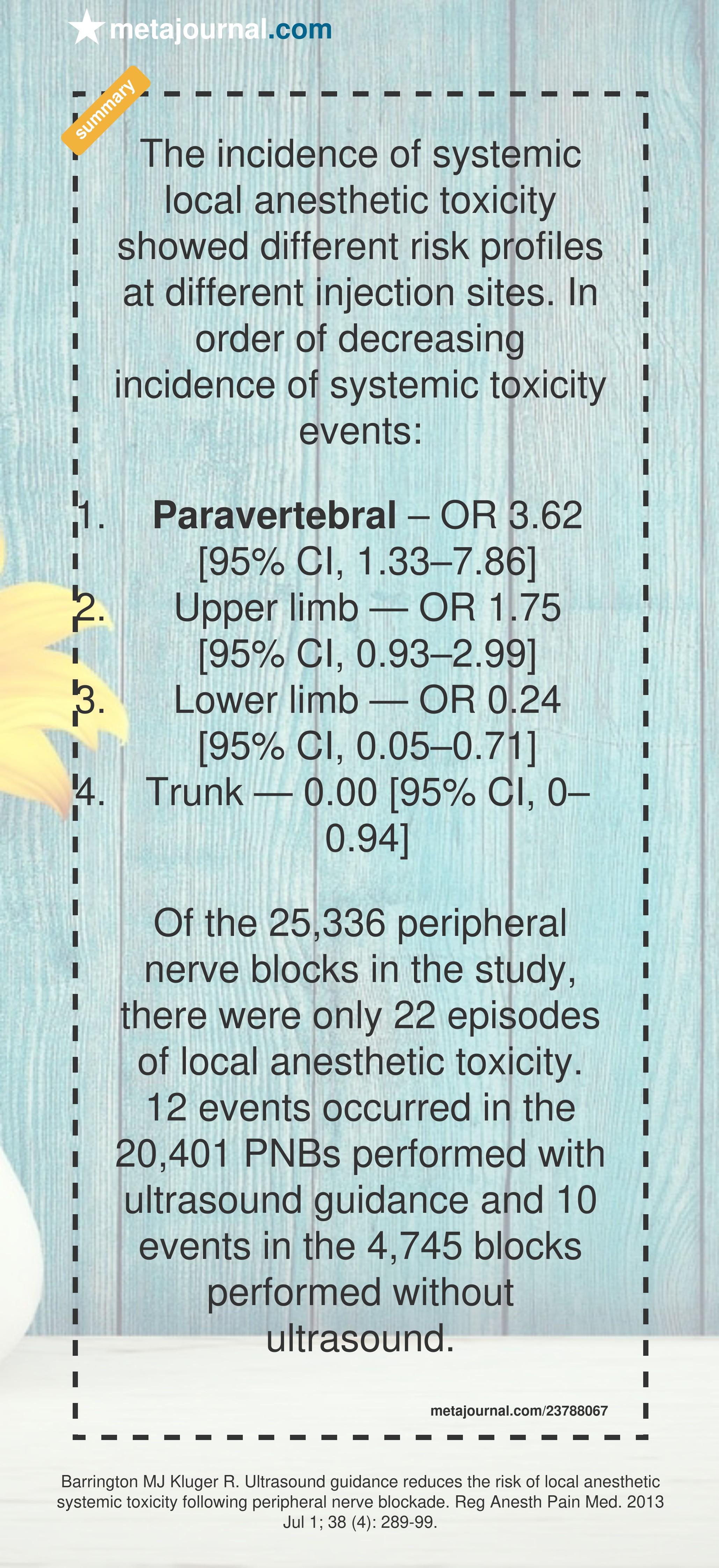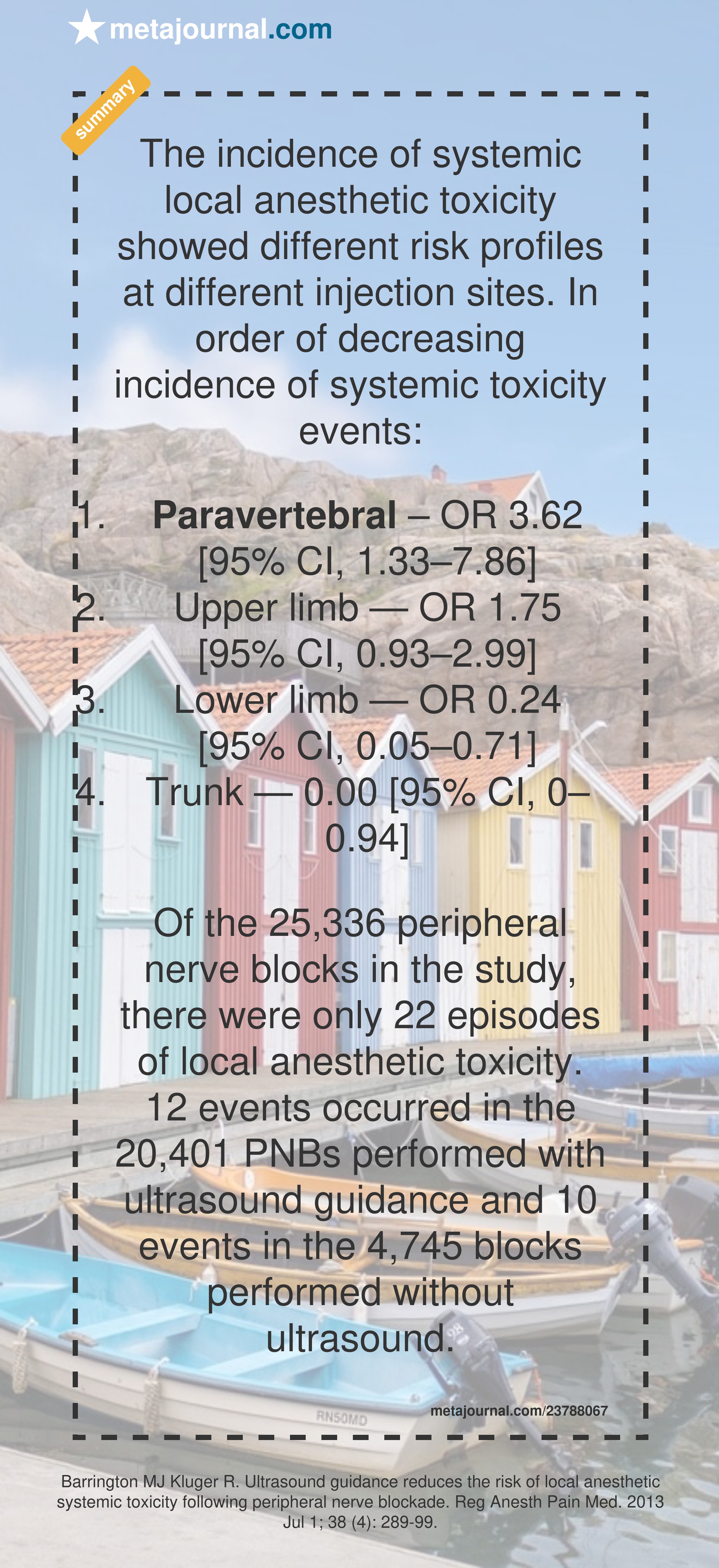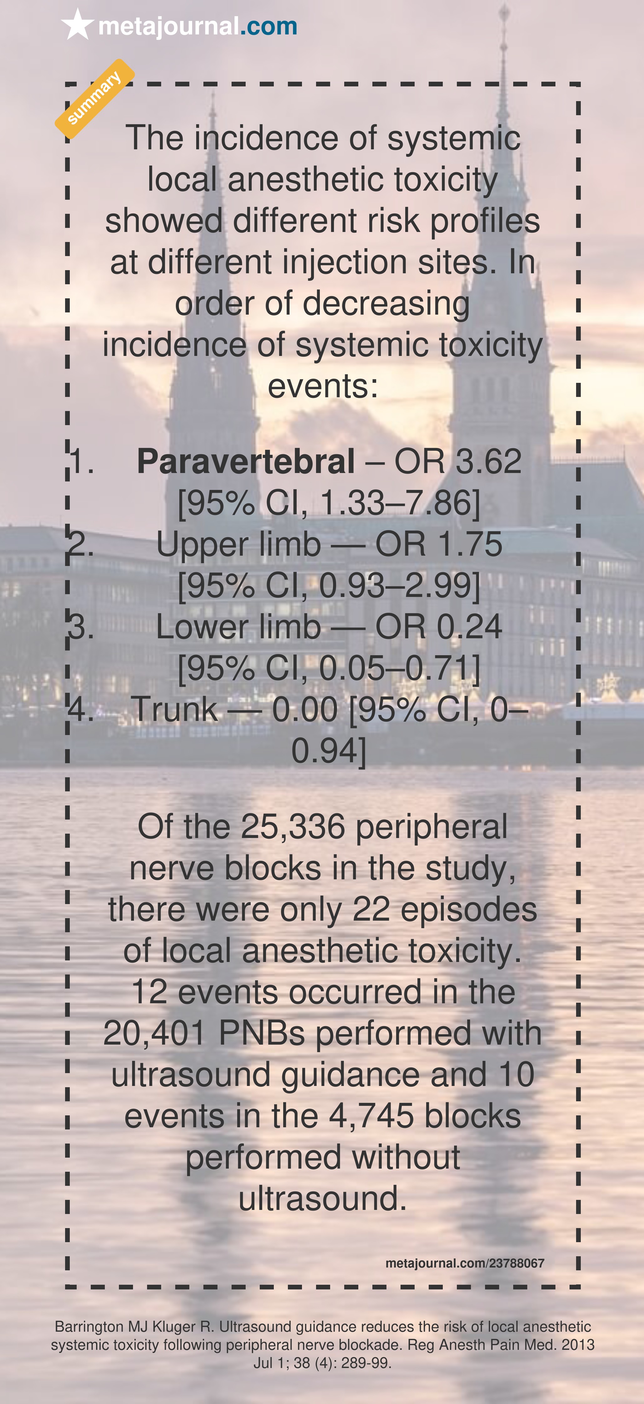 Of the 25,336 peripheral nerve blocks in the study, there were only 22 episodes of local anesthetic toxicity. 12 events occurred in the 20,401 PNBs performed with ultrasound guidance and 10 events in the 4,745 blocks performed without ultrasound.