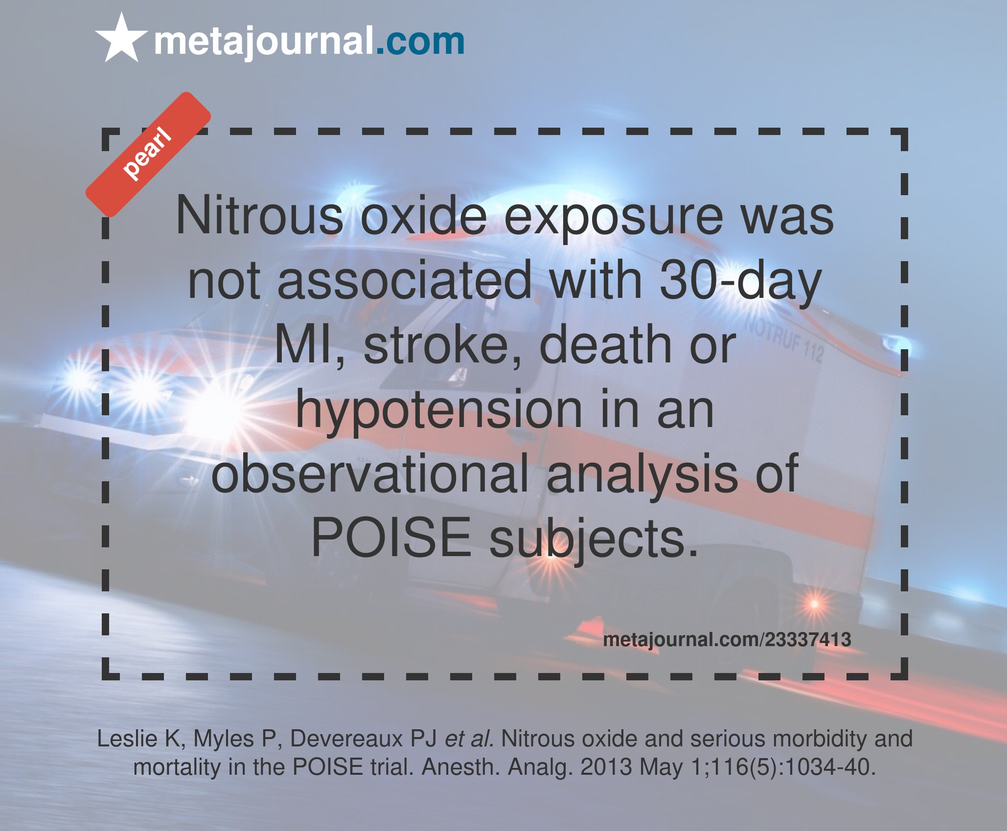 Nitrous oxide exposure was not associated with 30-day MI, stroke, death or hypotension in an observational analysis of POISE subjects.