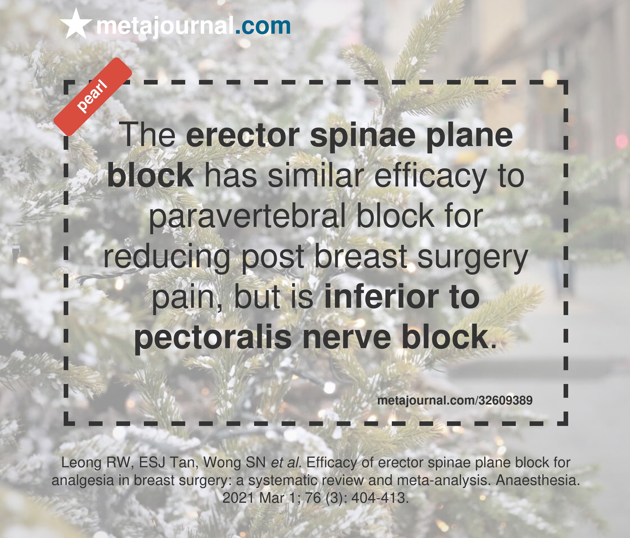 The erector spinae plane block has similar efficacy to paravertebral block for reducing post breast surgery pain, but is inferior to pectoralis nerve block.