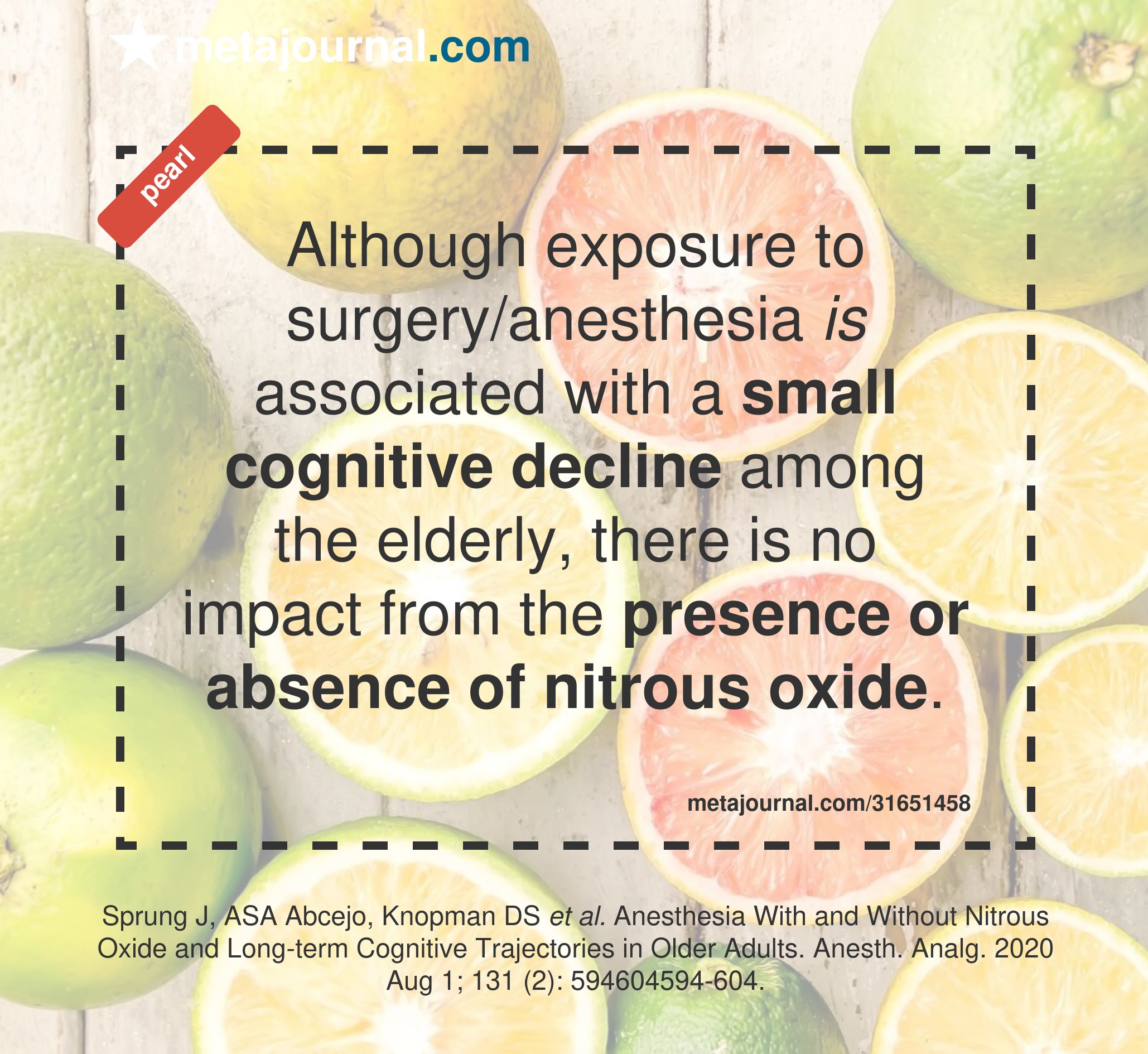 Although exposure to surgery/anesthesia is associated with a small cognitive decline among the elderly, there is no impact from the presence or absence of nitrous oxide.