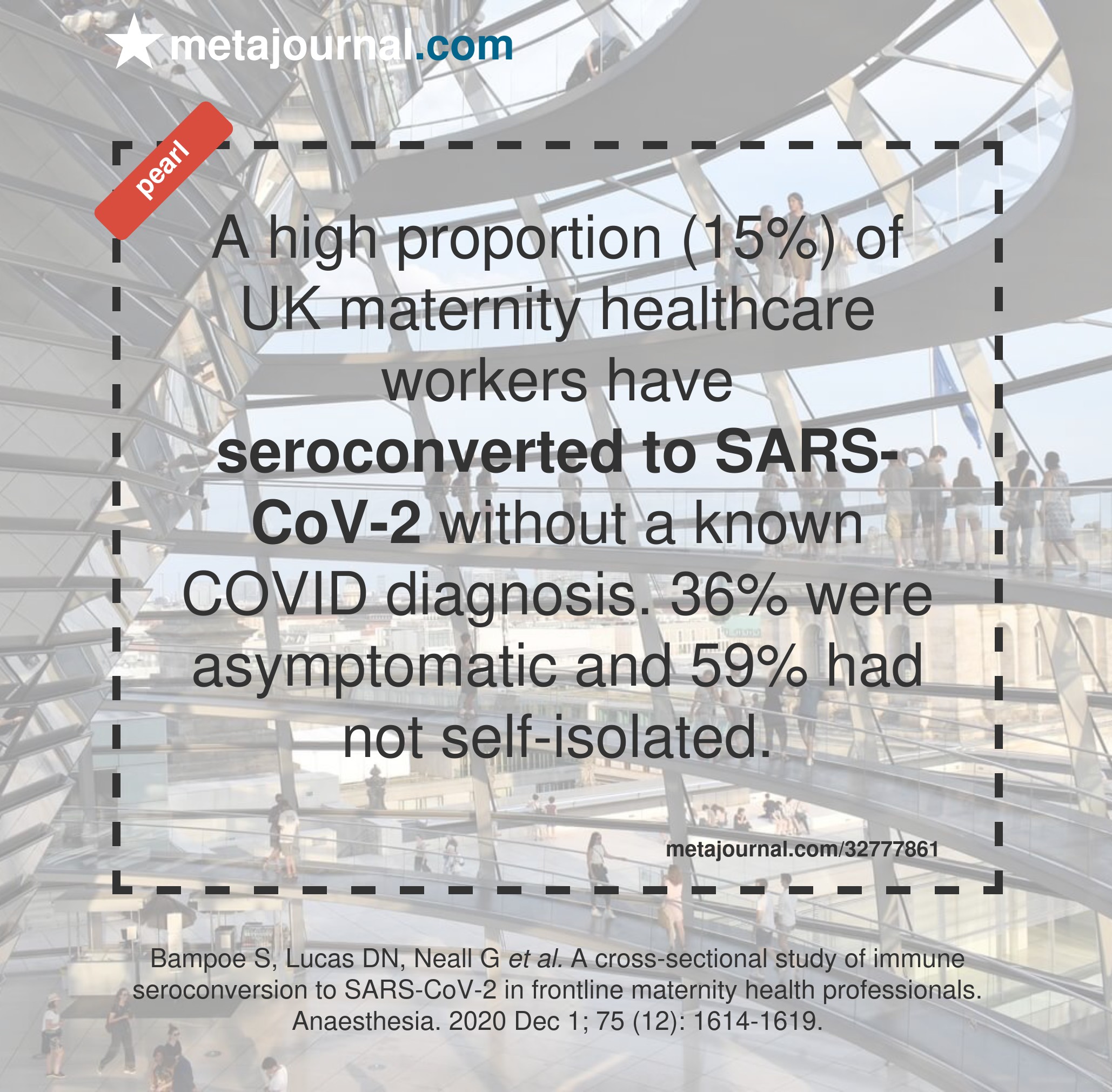A high proportion (15%) of UK maternity healthcare workers have seroconverted to SARS-CoV-2 without a known COVID diagnosis. 36% were asymptomatic and 59% had not self-isolated.