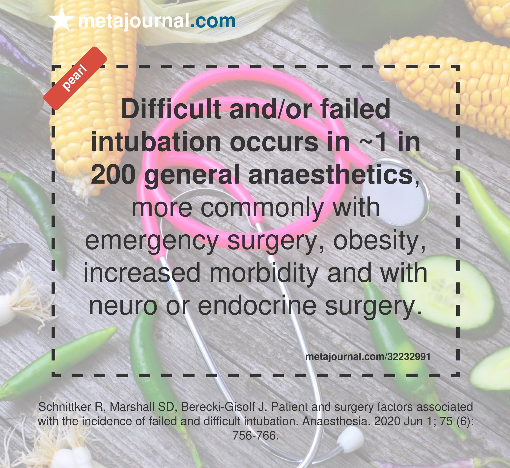 Difficult and/or failed intubation occurs in ~1 in 200 general anaesthetics, more commonly with emergency surgery, obesity, increased morbidity and with neuro or endocrine surgery.