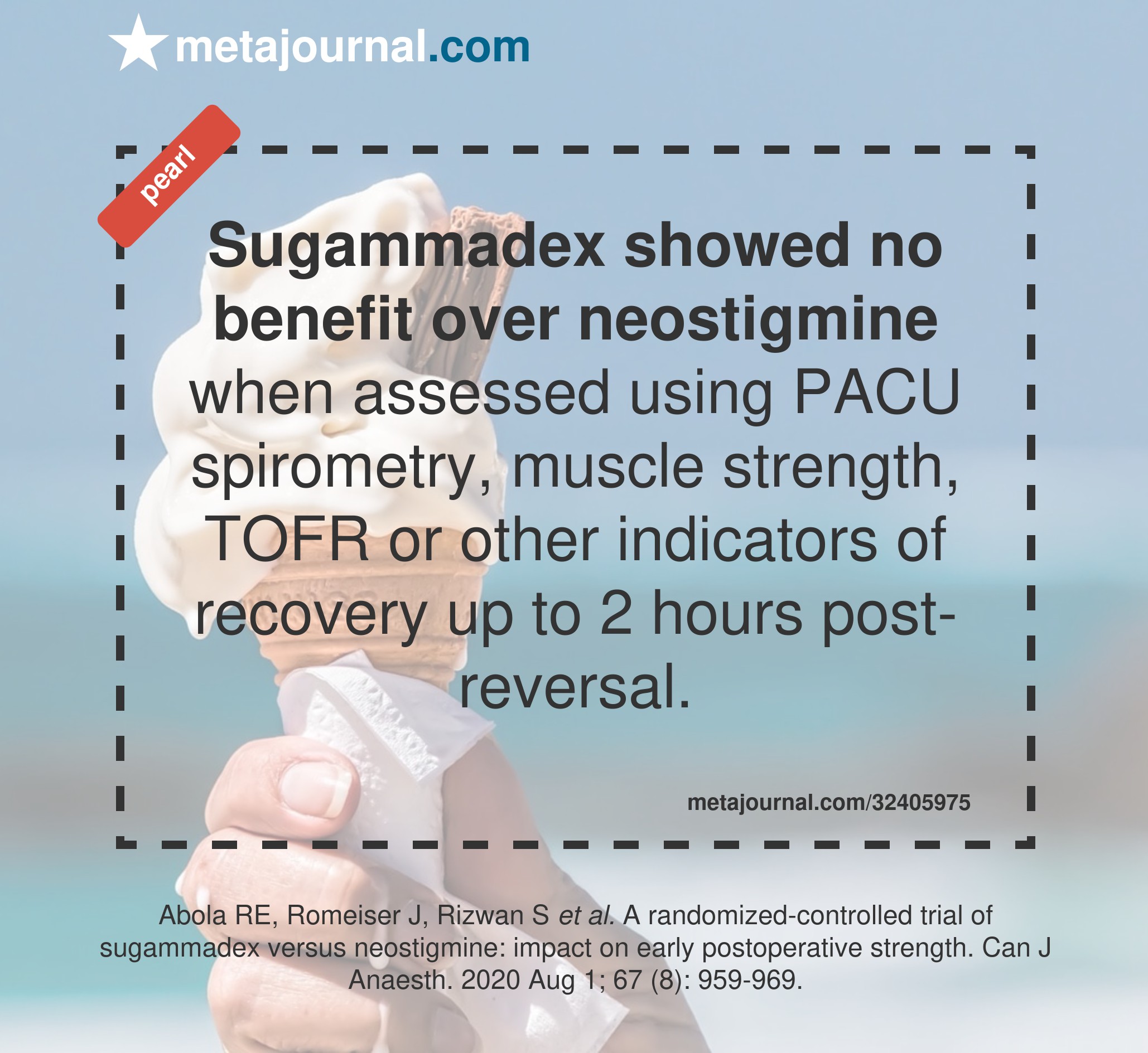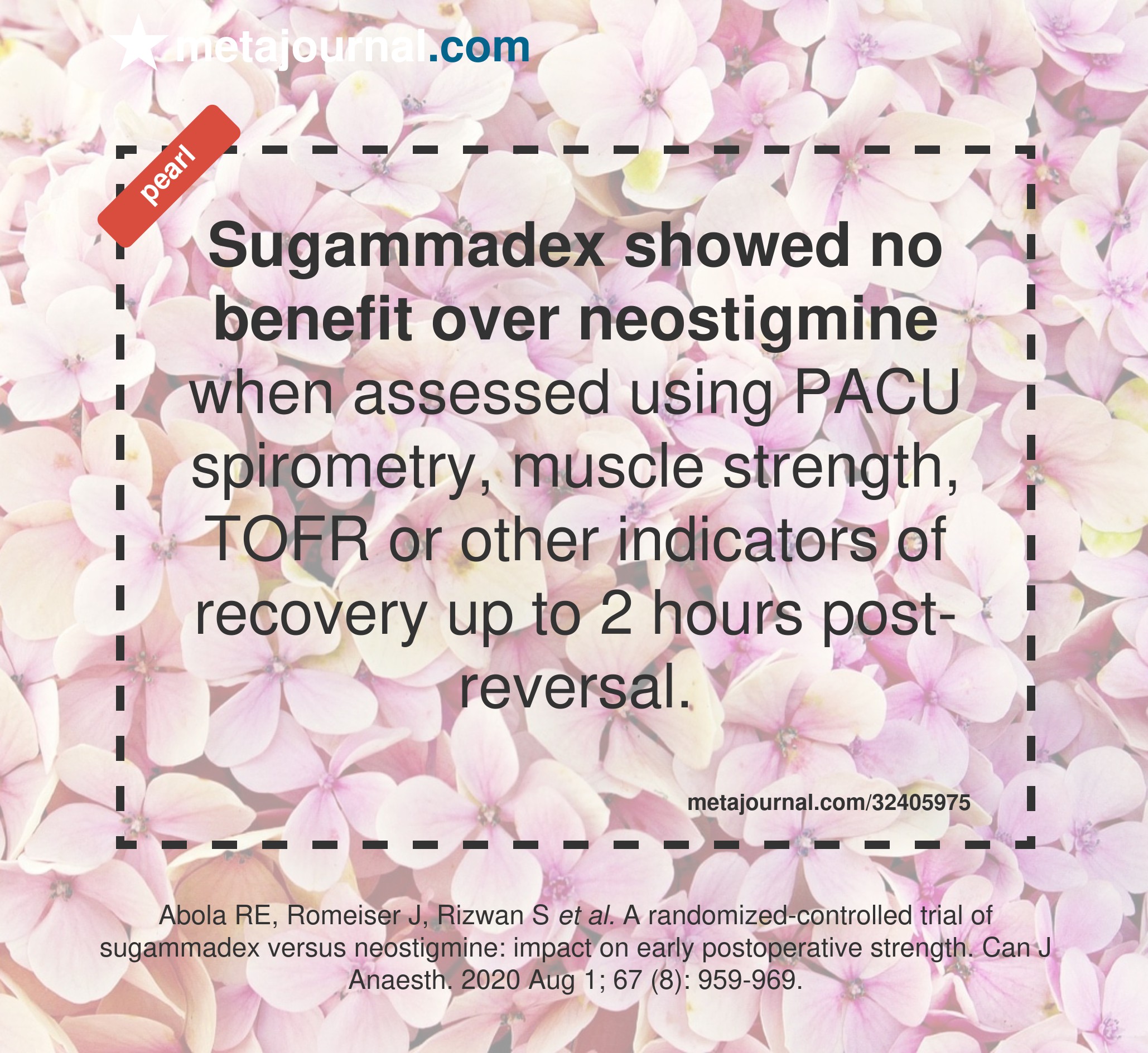 Sugammadex showed no benefit over neostigmine when assessed using PACU spirometry, muscle strength, TOFR or other indicators of recovery up to 2 hours post-reversal.