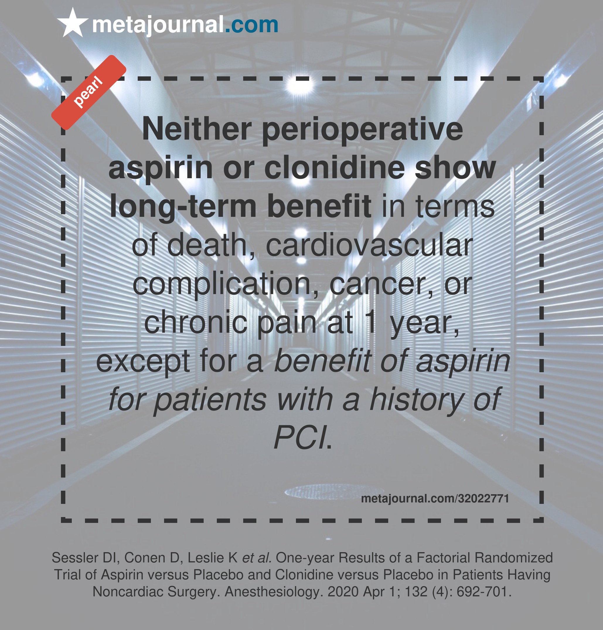 Neither perioperative aspirin or clonidine show long-term benefit in terms of death, cardiovascular complication, cancer, or chronic pain at 1 year, except for a benefit of aspirin for patients with a history of PCI.