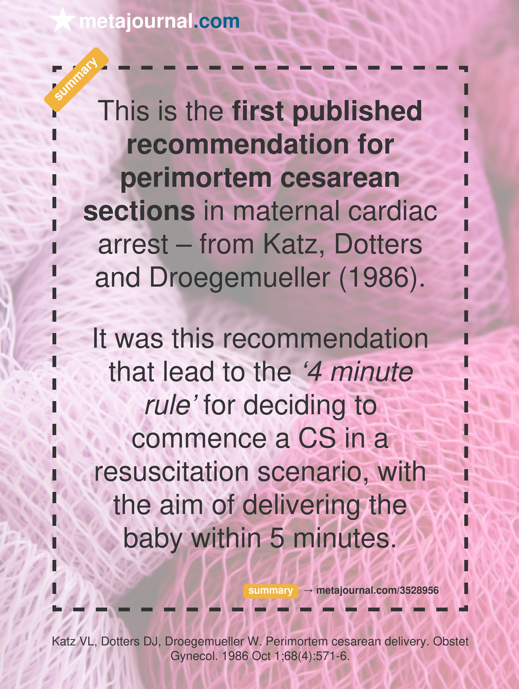 This is the first published recommendation for perimortem cesarean sections in maternal cardiac arrest – from Katz, Dotters and Droegemueller (1986).