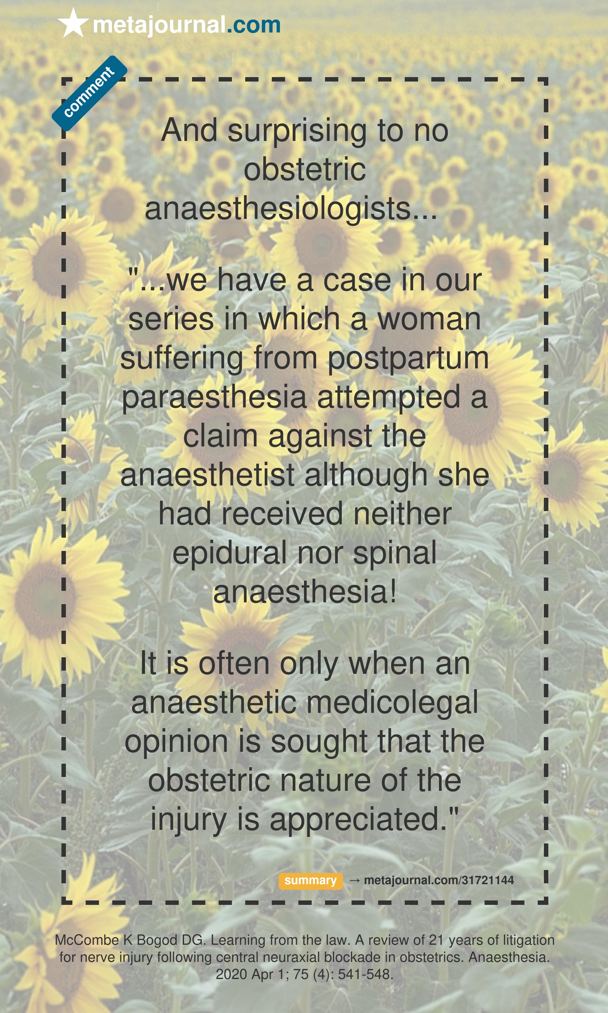 It is often only when an anaesthetic medicolegal opinion is sought that the obstetric nature of the injury is appreciated."