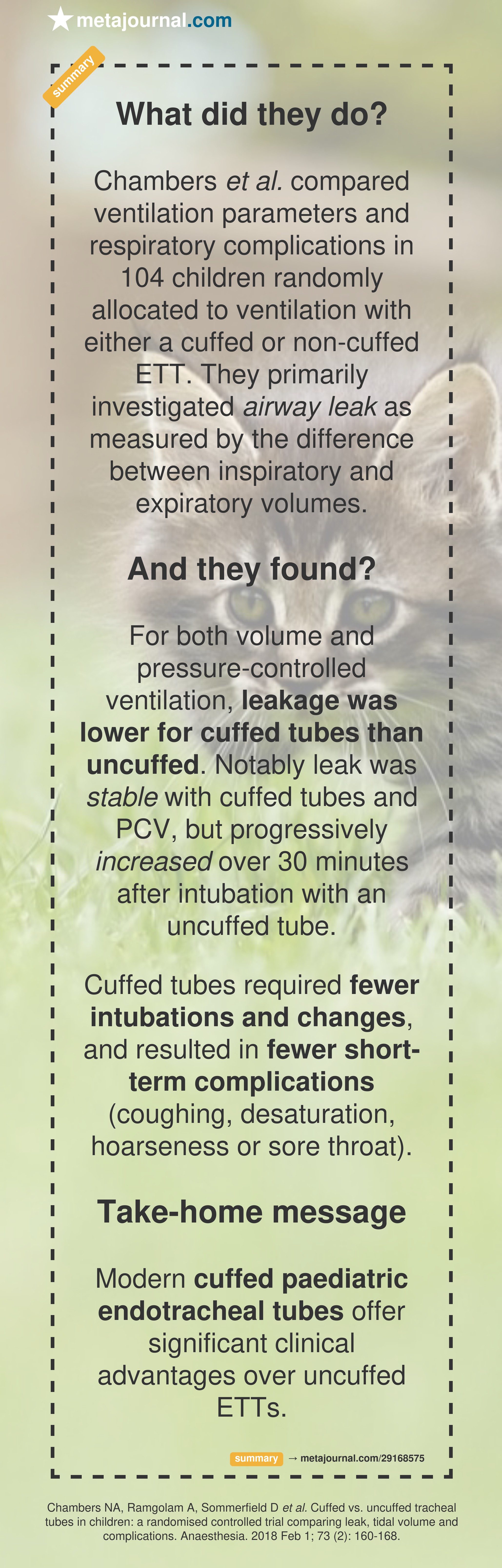 Chambers et al. compared ventilation parameters and respiratory complications in 104 children randomly allocated to ventilation with either a cuffed or non-cuffed ETT. They primarily investigated airway leak as measured by the difference between inspiratory and expiratory volumes.
