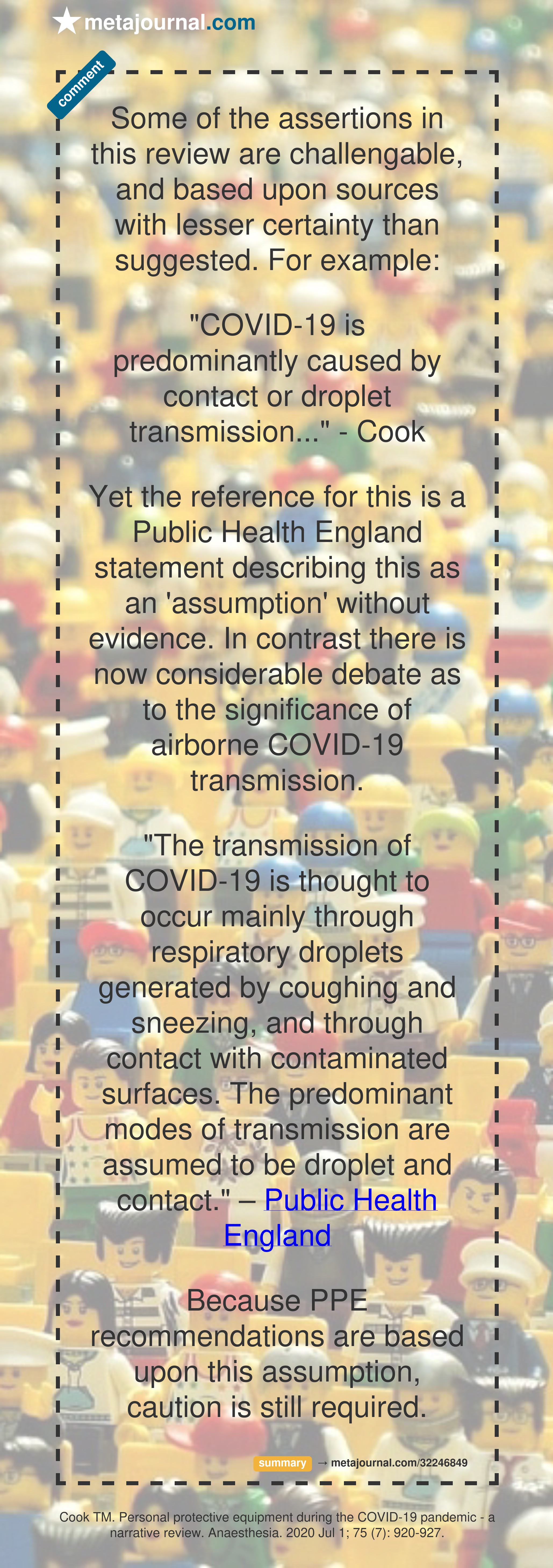 Acknowledging the difficulty of balancing PPE supply and demand, the tone of this review tends to be biased toward hopeful but unproven assumptions that airborne transmission is not significant. There is considerable concern that this is in fact not true.