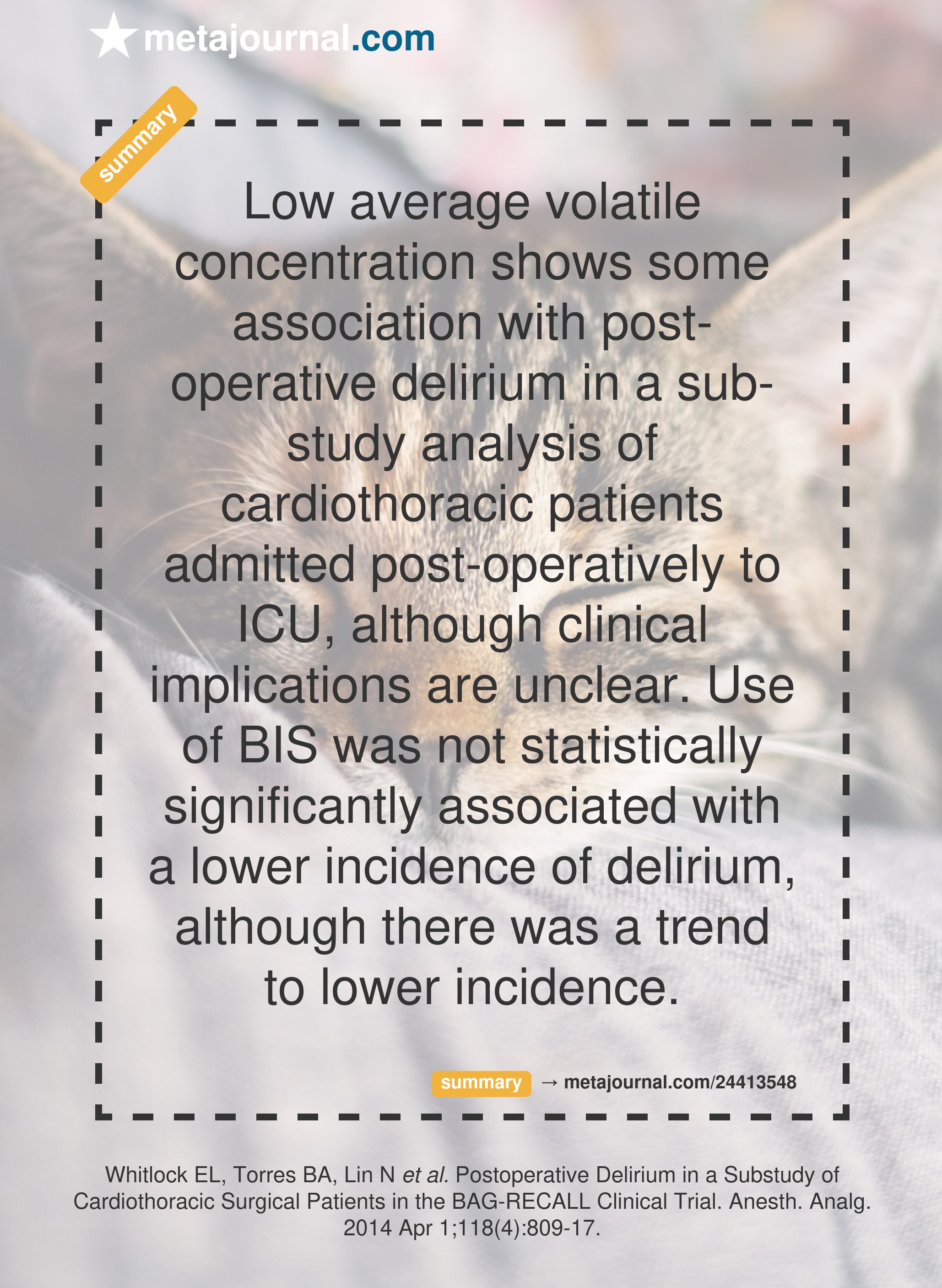 Low average volatile concentration shows some association with post-operative delirium in a sub-study analysis of cardiothoracic patients admitted post-operatively to ICU, although clinical implications are unclear. Use of BIS was not statistically significantly associated with a lower incidence of delirium, although there was a trend to lower incidence.