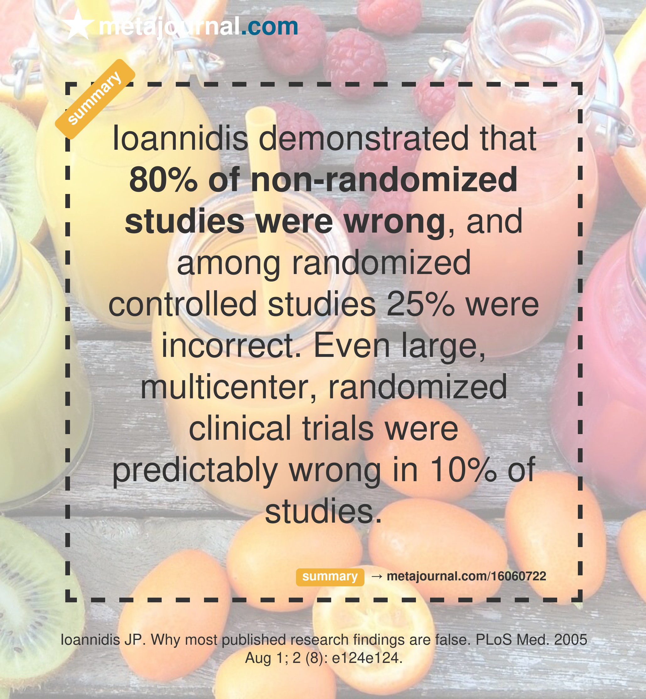 Ioannidis demonstrated that 80% of non-randomized studies were wrong, and among randomized controlled studies 25% were incorrect. Even large, multicenter, randomized clinical trials were predictably wrong in 10% of studies.