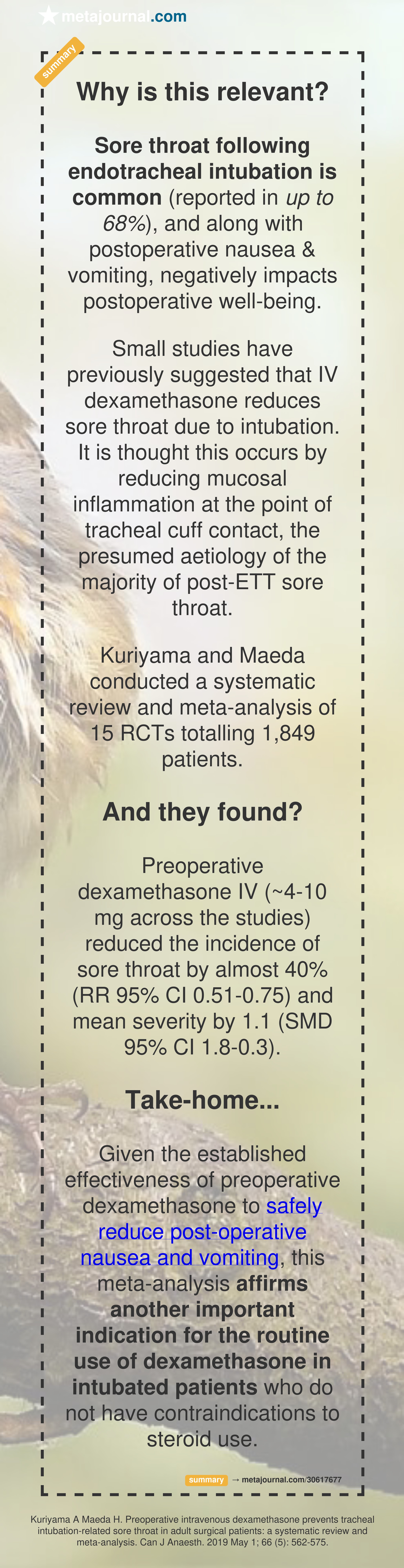 Small studies have previously suggested that IV dexamethasone reduces sore throat due to intubation. It is thought this occurs by reducing mucosal inflammation at the point of tracheal cuff contact, the presumed aetiology of the majority of post-ETT sore throat.