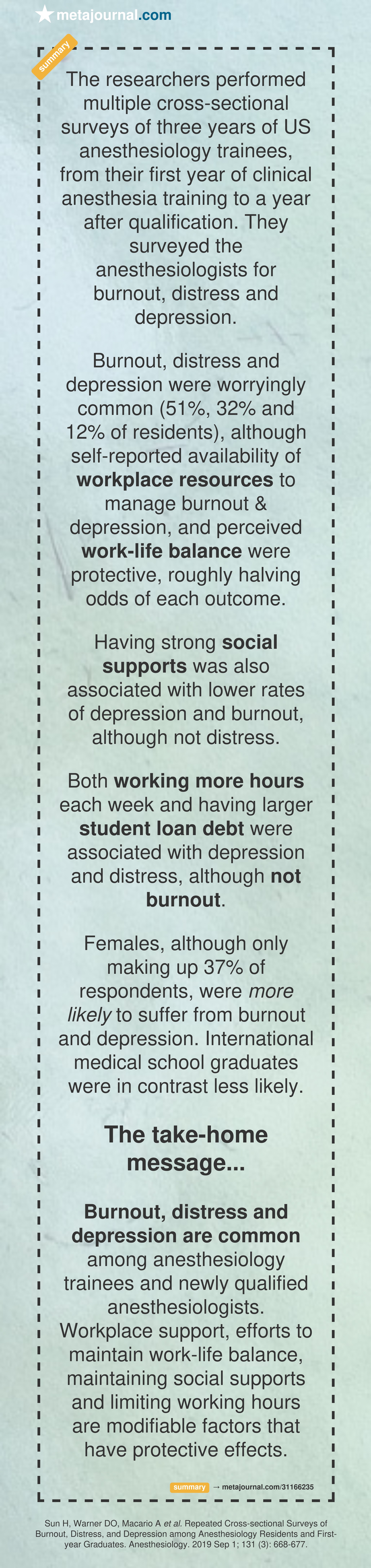 The researchers performed multiple cross-sectional surveys of three years of US anesthesiology trainees, from their first year of clinical anesthesia training to a year after qualification. They surveyed the anesthesiologists for burnout, distress and depression.