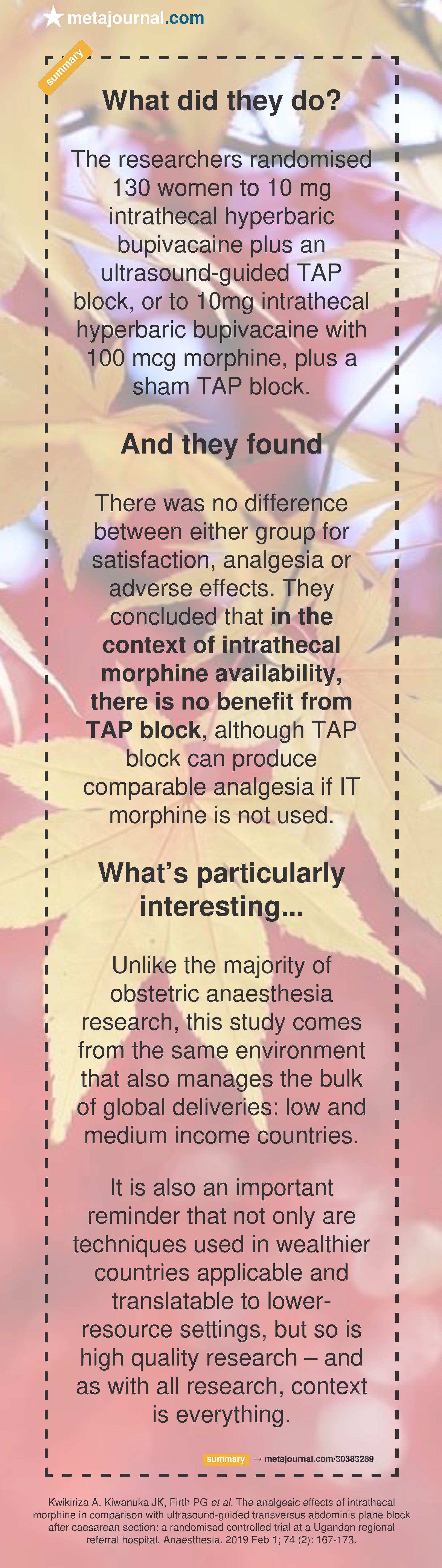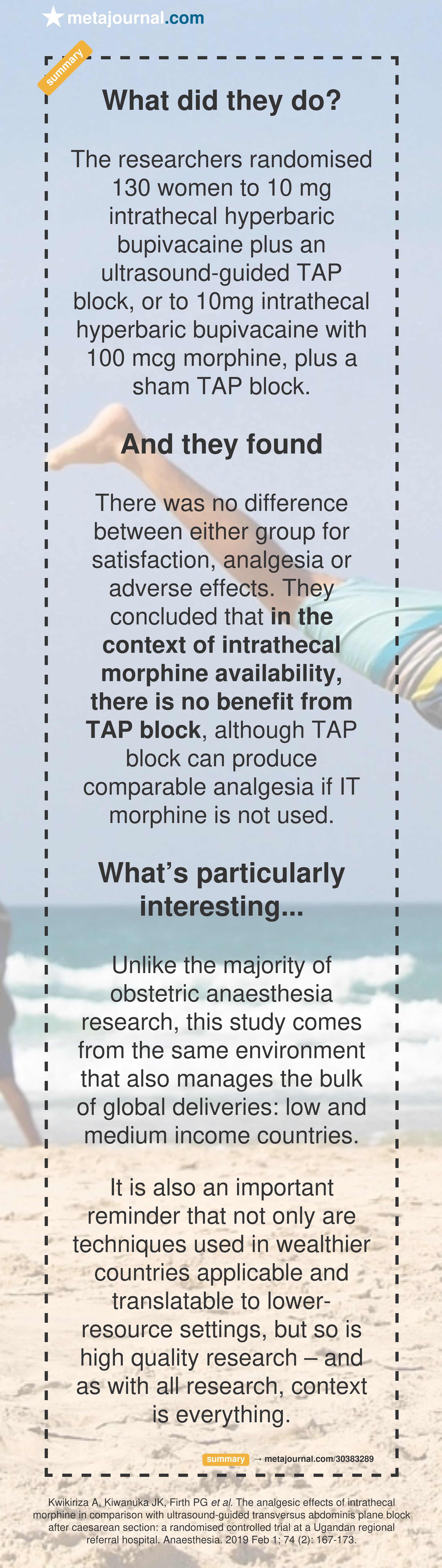 Unlike the majority of obstetric anaesthesia research, this study comes from the same environment that also manages the bulk of global deliveries: low and medium income countries.