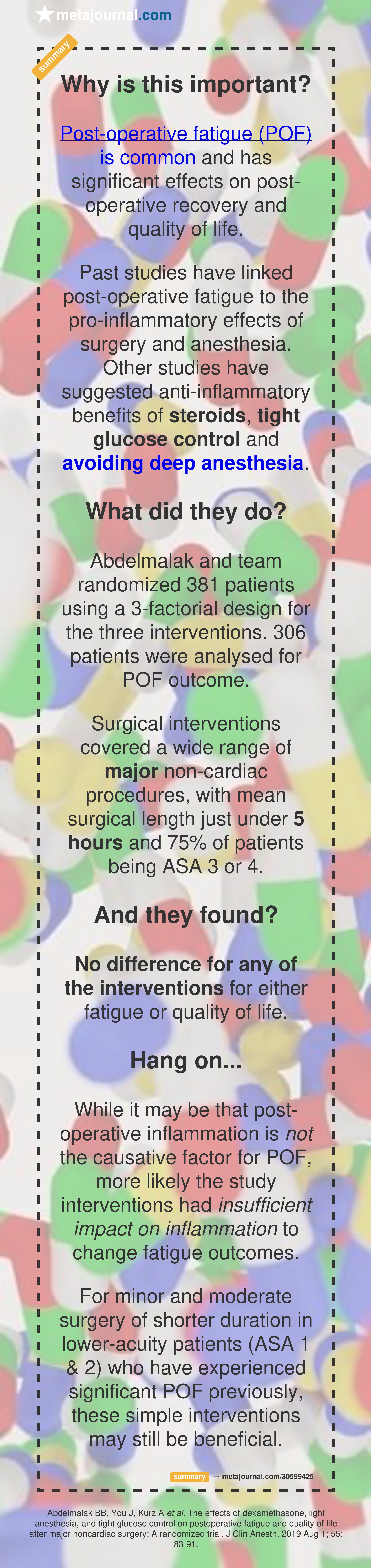 Past studies have linked post-operative fatigue to the pro-inflammatory effects of surgery and anesthesia. Other studies have suggested anti-inflammatory benefits of steroids, tight glucose control and avoiding deep anesthesia.