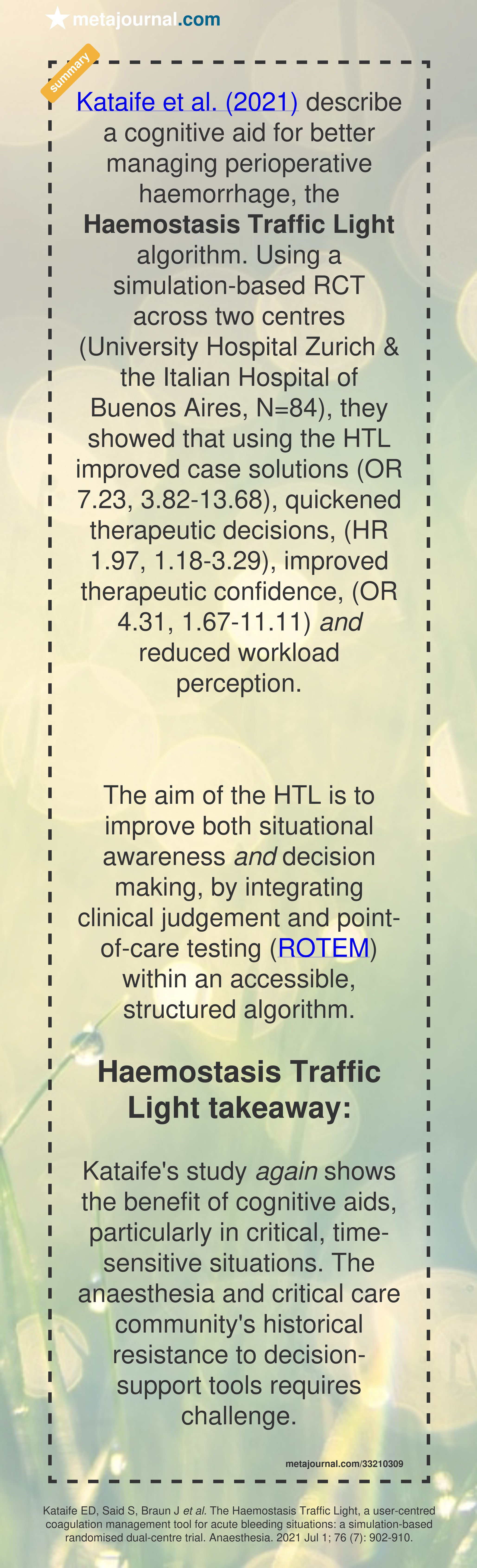 Kataife et al. (2021) describe a cognitive aid for better managing perioperative haemorrhage, the Haemostasis Traffic Light algorithm. Using a simulation-based RCT across two centres (University Hospital Zurich & the Italian Hospital of Buenos Aires, N=84), they showed that using the HTL improved case solutions (OR 7.23, 3.82-13.68), quickened therapeutic decisions, (HR 1.97, 1.18-3.29), improved therapeutic confidence, (OR 4.31, 1.67-11.11) and reduced workload perception.