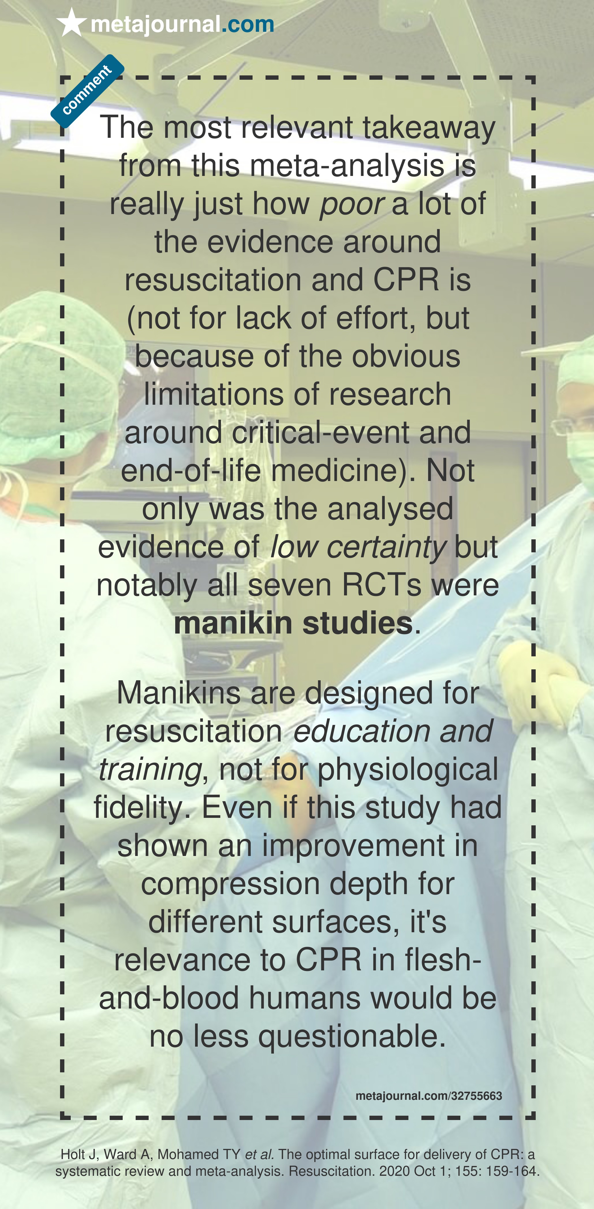 The most relevant takeaway from this meta-analysis is really just how poor a lot of the evidence around resuscitation and CPR is (not for lack of effort, but because of the obvious limitations of research around critical-event and end-of-life medicine). Not only was the analysed evidence of low certainty but notably all seven RCTs were manikin studies.