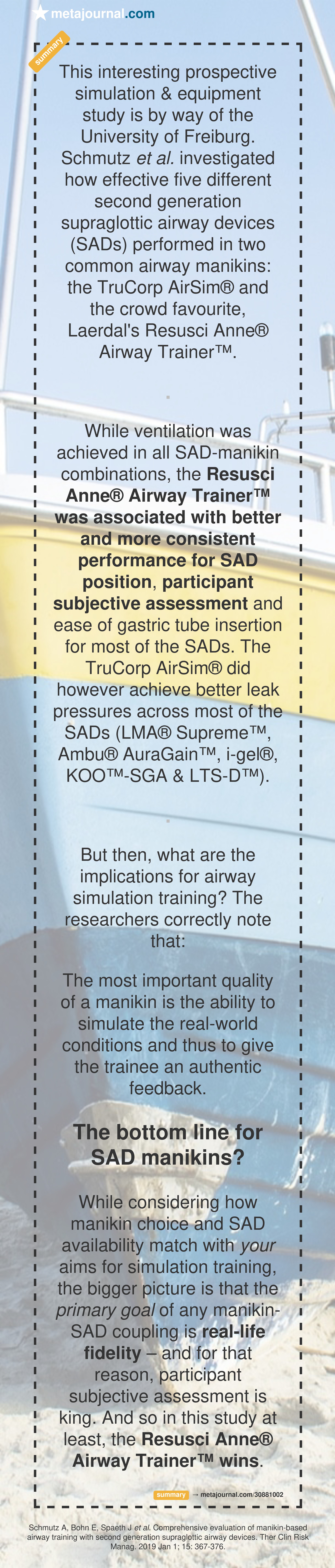 While considering how manikin choice and SAD availability match with your aims for simulation training, the bigger picture is that the primary goal of any manikin-SAD coupling is real-life fidelity – and for that reason, participant subjective assessment is king. And so in this study at least, the Resusci Anne® Airway Trainer™ wins.