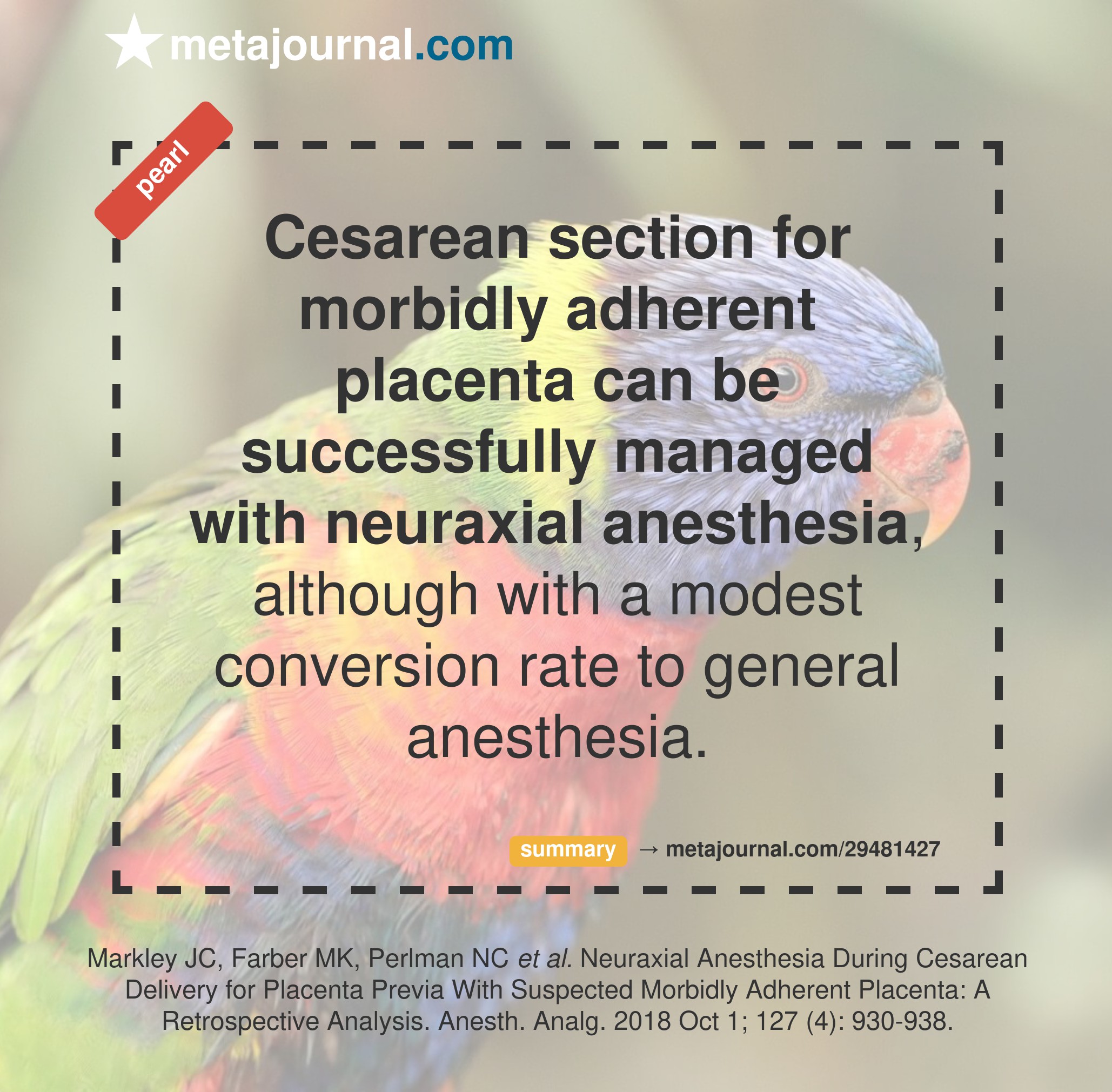 Although retrospective, this data again reassures that neuraxial anesthesia can be a safe and appropriate choice for cesarean delivery with placenta accreta, increta or percreta. The big question will be whether you are happy managing an emergent NA-GA conversion and intubation in the 1-in-8 requiring it (or 1-in-5 with hysterectomy) or plan for an elective GA pre-surgery.