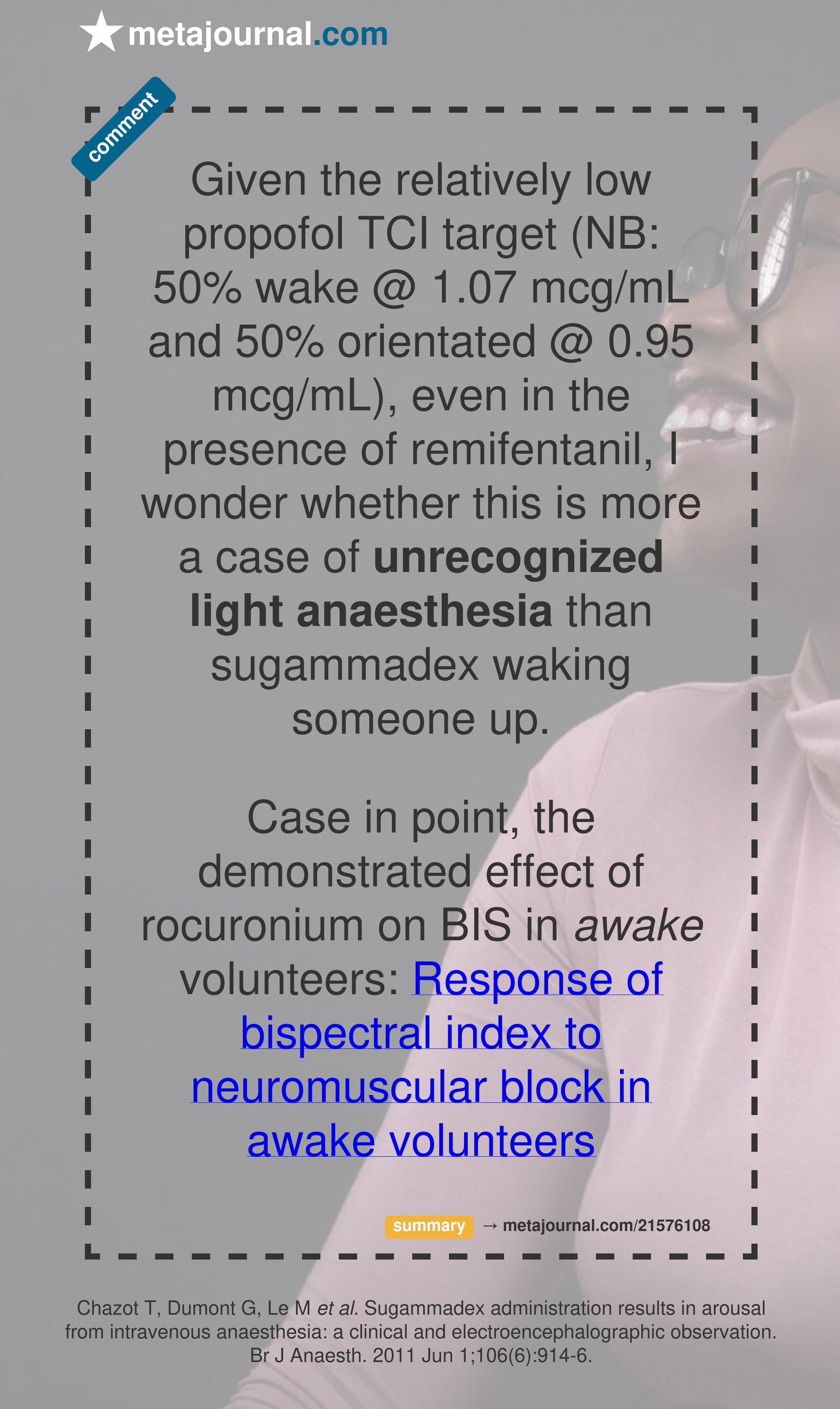 Given the relatively low propofol TCI target (NB: 50% wake @ 1.07 mcg/mL and 50% orientated @ 0.95 mcg/mL), even in the presence of remifentanil, I wonder whether this is more a case of unrecognized light anaesthesia than sugammadex waking someone up.