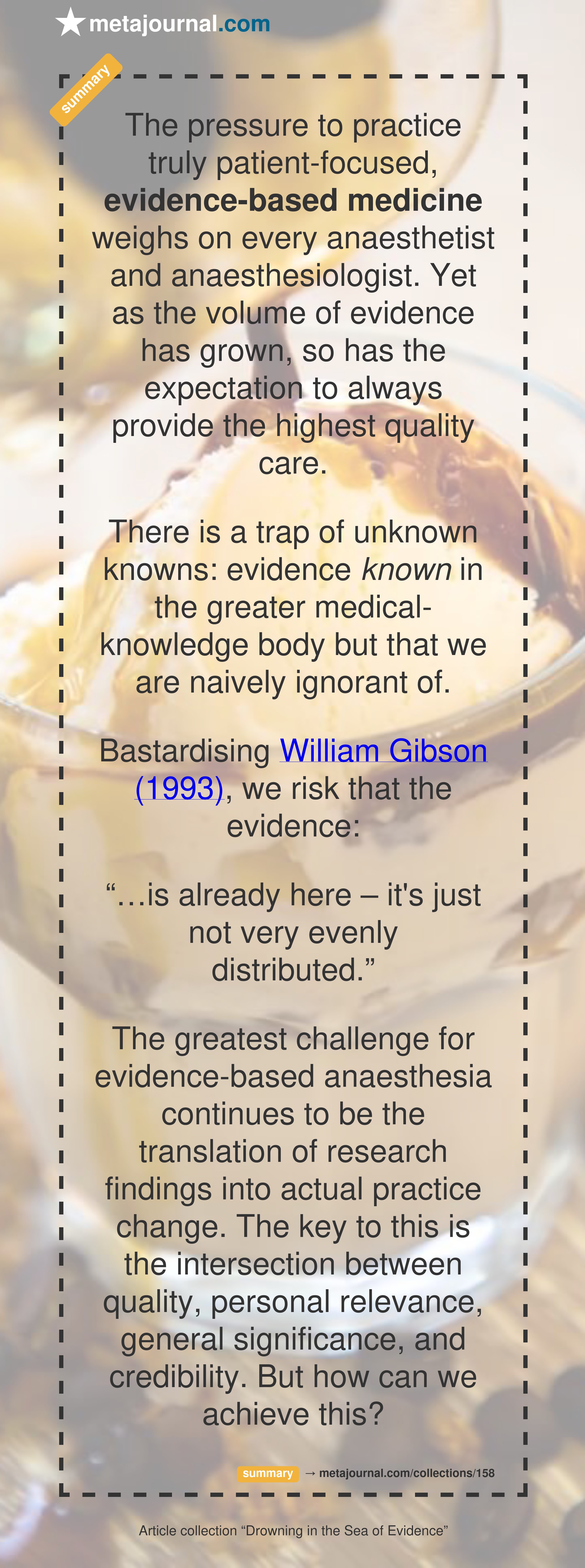 The pressure to practice truly patient-focused, evidence-based medicine weighs on every anaesthetist and anaesthesiologist. Yet as the volume of evidence has grown, so has the expectation to always provide the highest quality care.