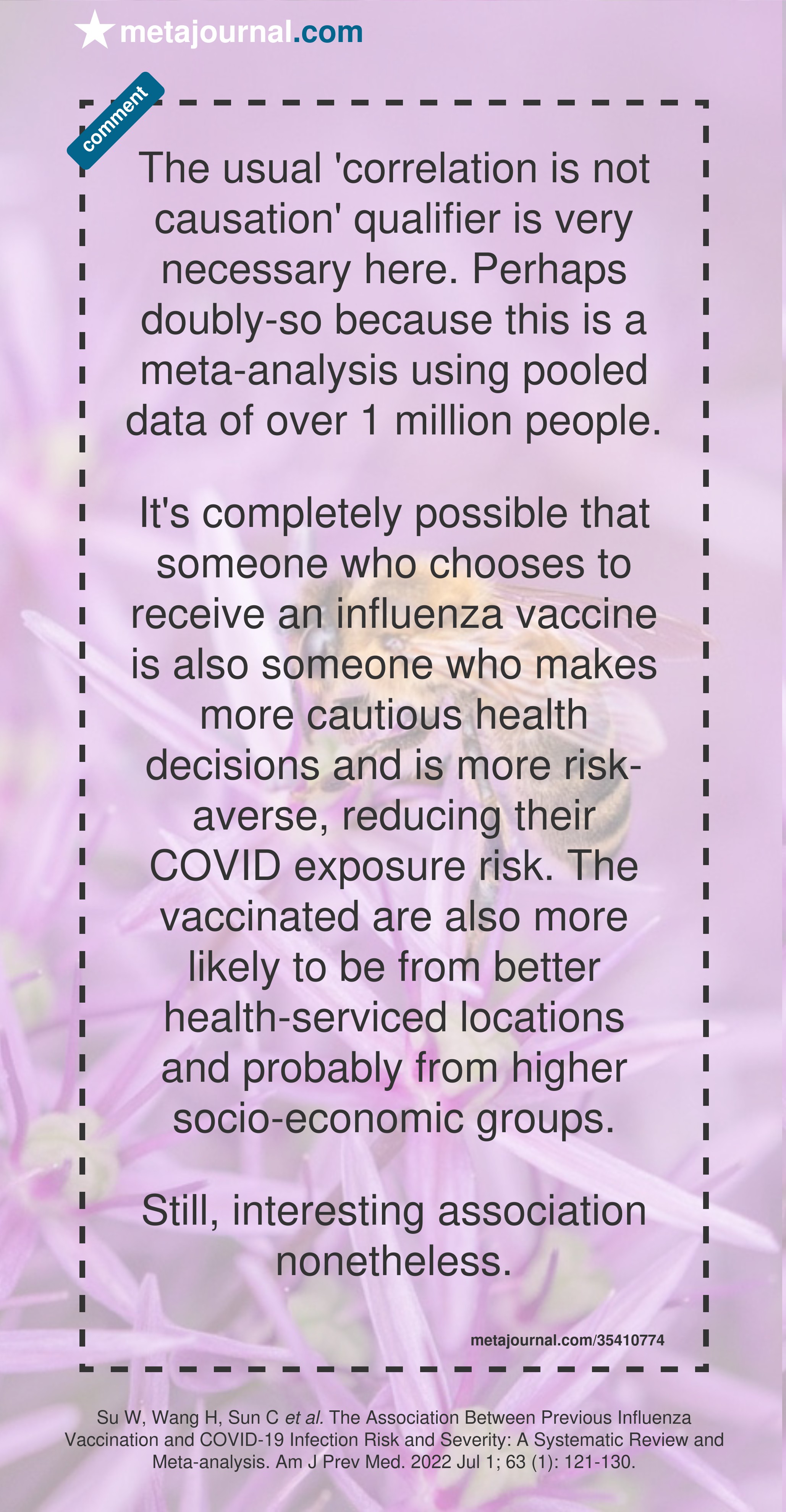 It's completely possible that someone who chooses to receive an influenza vaccine is also someone who makes more cautious health decisions and is more risk-averse, reducing their COVID exposure risk. The vaccinated are also more likely to be from better health-serviced locations and probably from higher socio-economic groups.