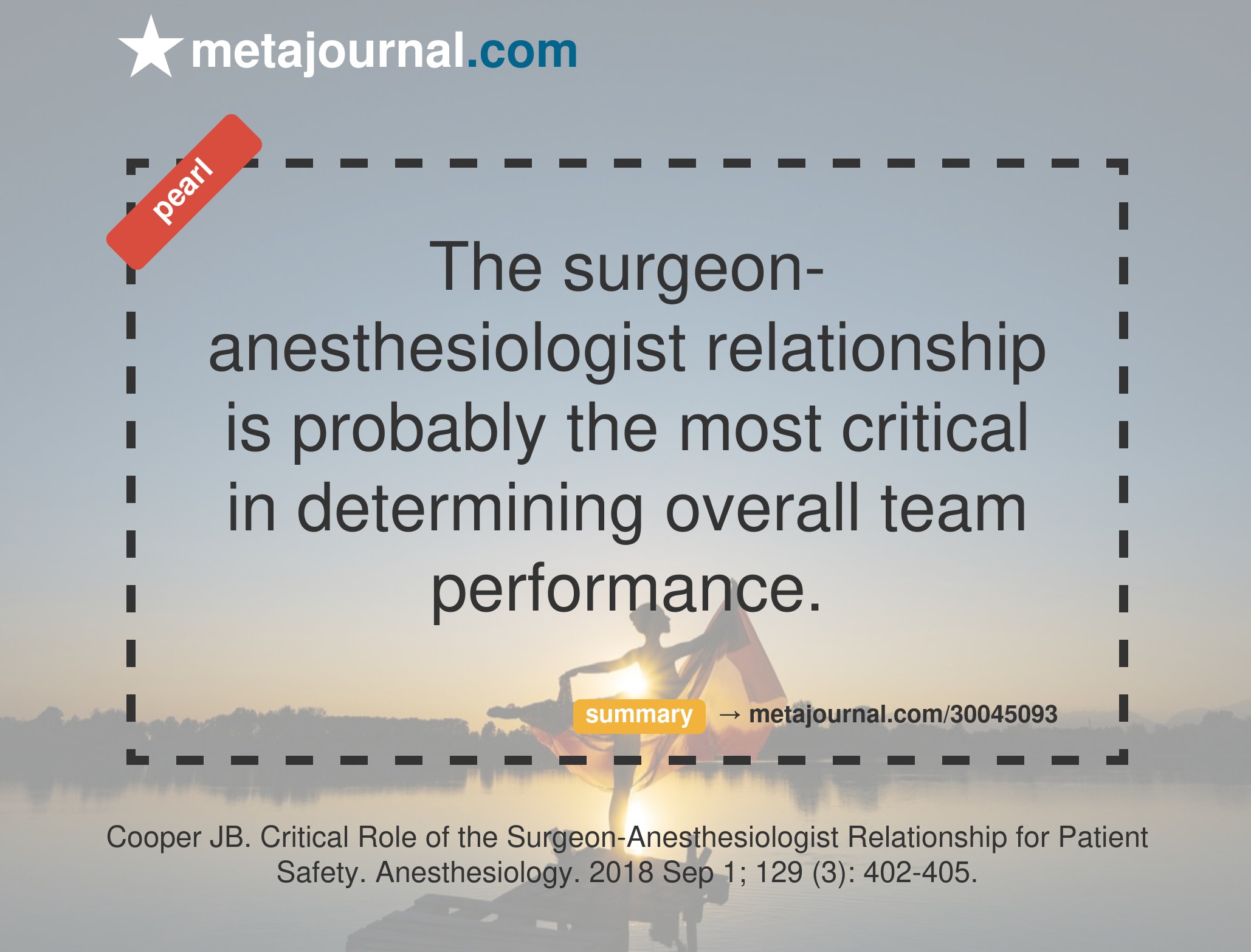 An interesting exploration of the surgeon-anesthesiologist relationship, framed in terms of it being the critical dyad of the operating theatre team.