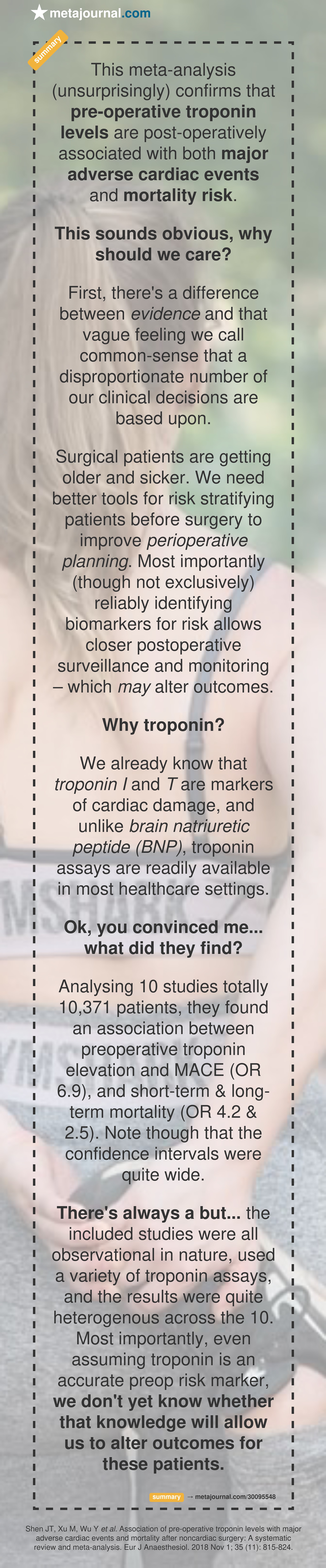 There's always a but... the included studies were all observational in nature, used a variety of troponin assays, and the results were quite heterogenous across the 10. Most importantly, even assuming troponin is an accurate preop risk marker, we don't yet know whether that knowledge will allow us to alter outcomes for these patients.