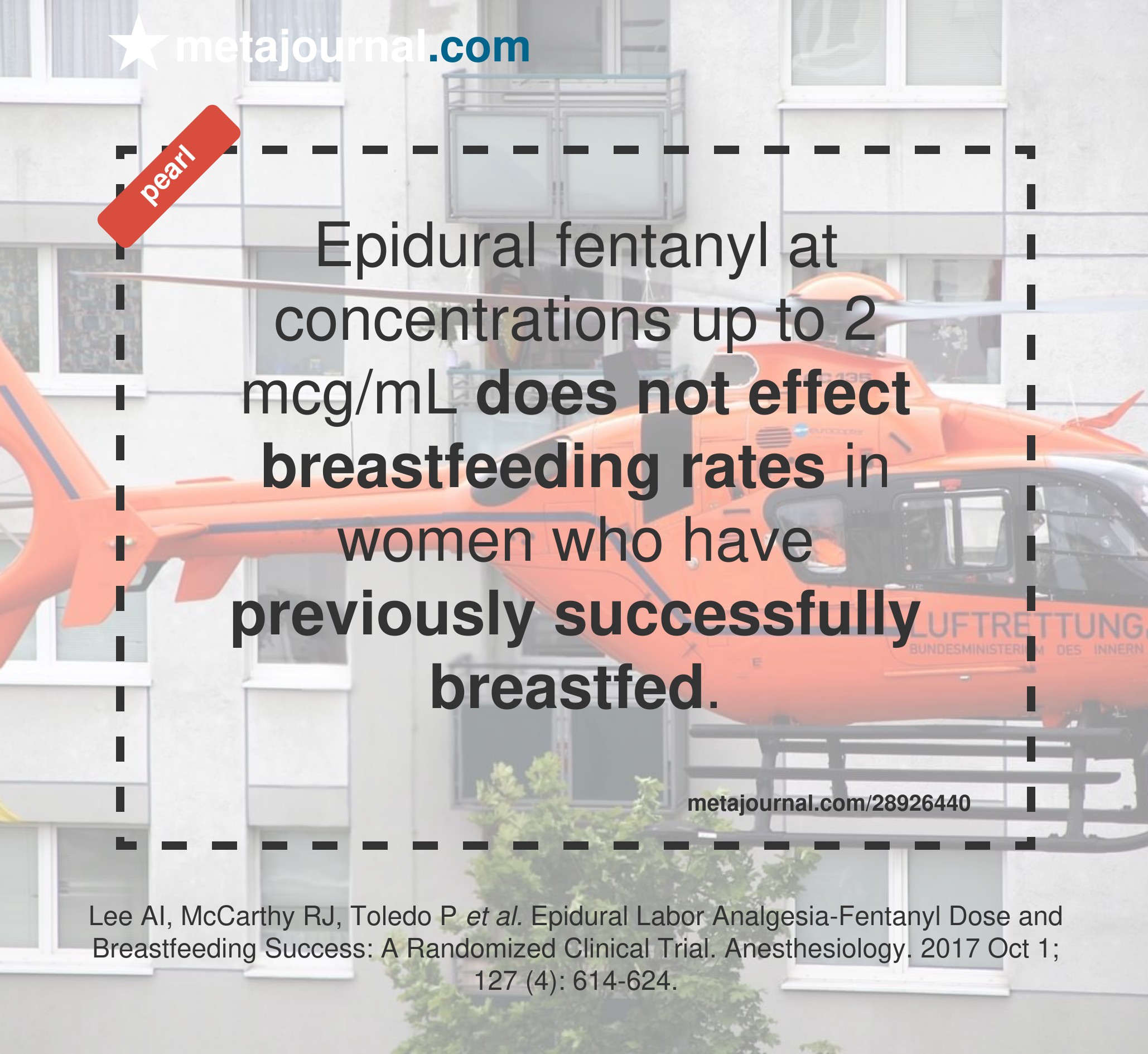 Notably Lee et al.’s 2017 RCT of over 300 women showed no effect of epidural fentanyl up to 2 mcg/mL and successful maternal breastfeeding up to 6 weeks.