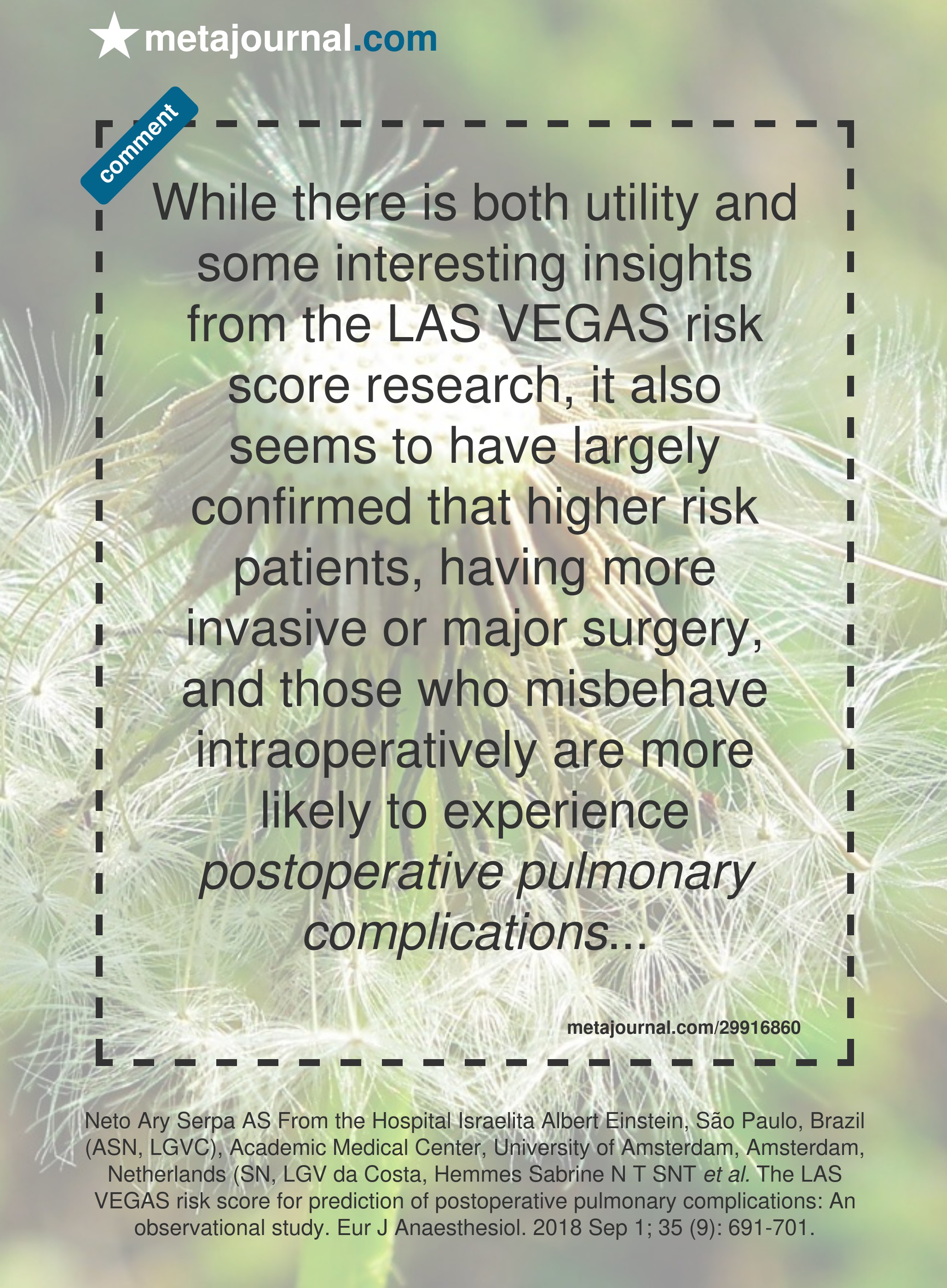 While there is both utility and some interesting insights from the LAS VEGAS risk score research, it also seems to have largely confirmed that higher risk patients, having more invasive or major surgery, and those who misbehave intraoperatively are more likely to experience postoperative pulmonary complications...