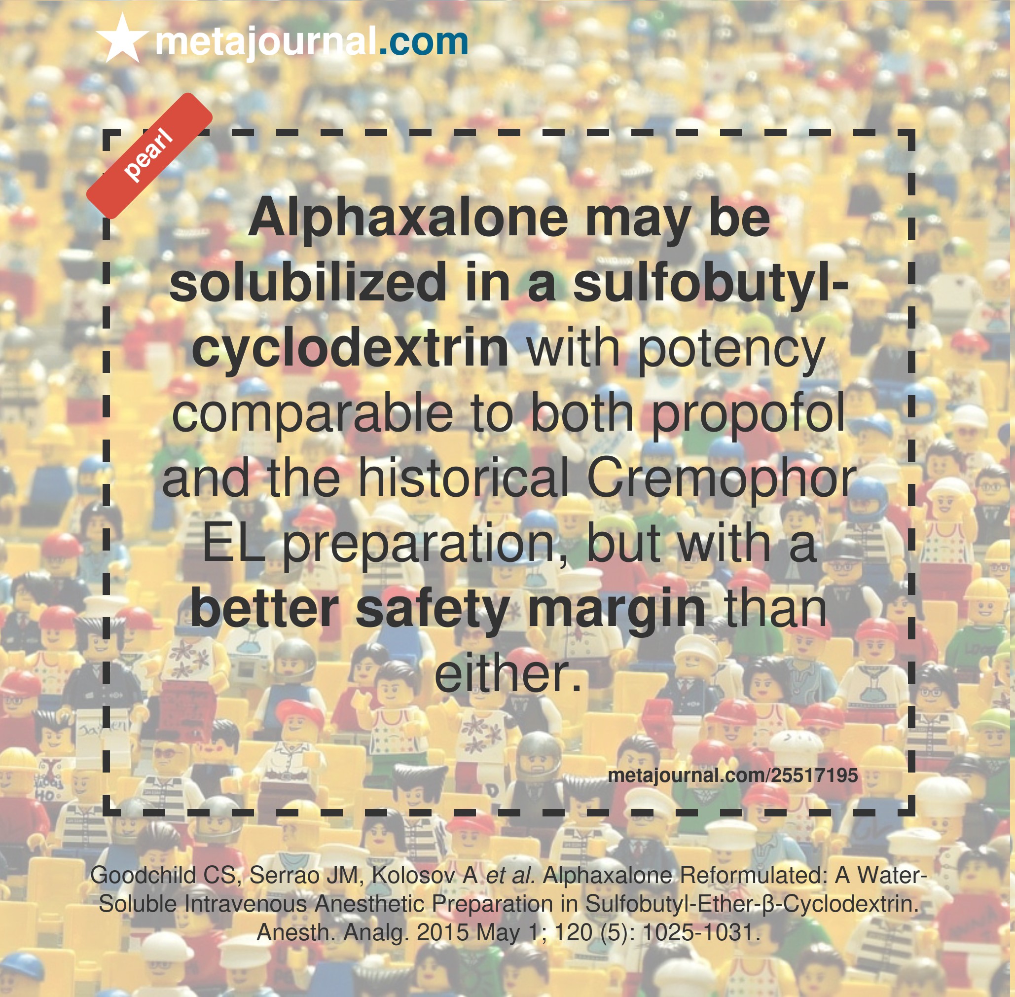 Alphaxalone may be solubilized in a sulfobutyl-cyclodextrin with potency comparable to both propofol and the historical Cremophor EL preparation, but with a better safety margin than either.
