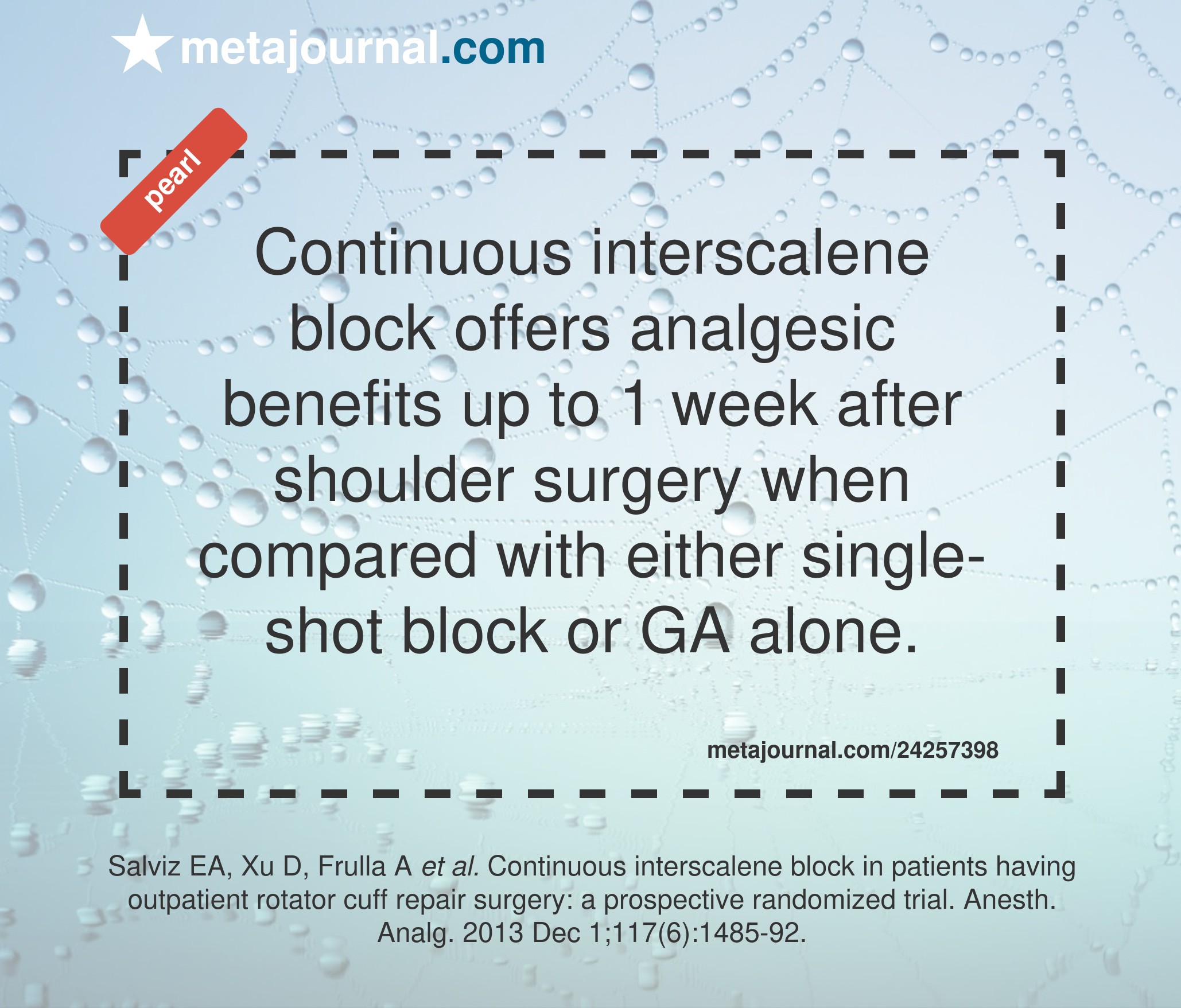 Continuous interscalene block offers analgesic benefits up to 1 week after shoulder surgery when compared with either single-shot block or GA alone.