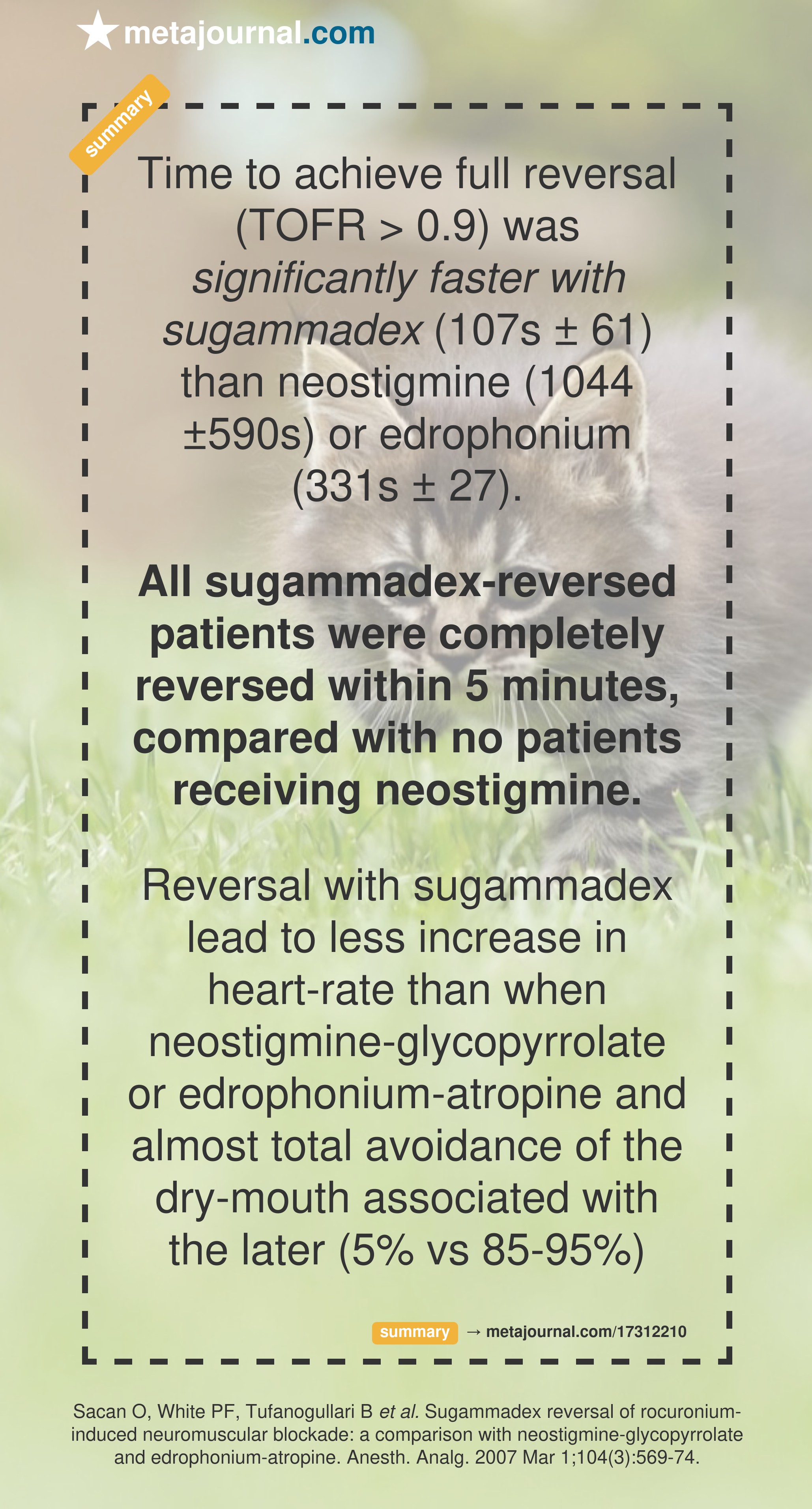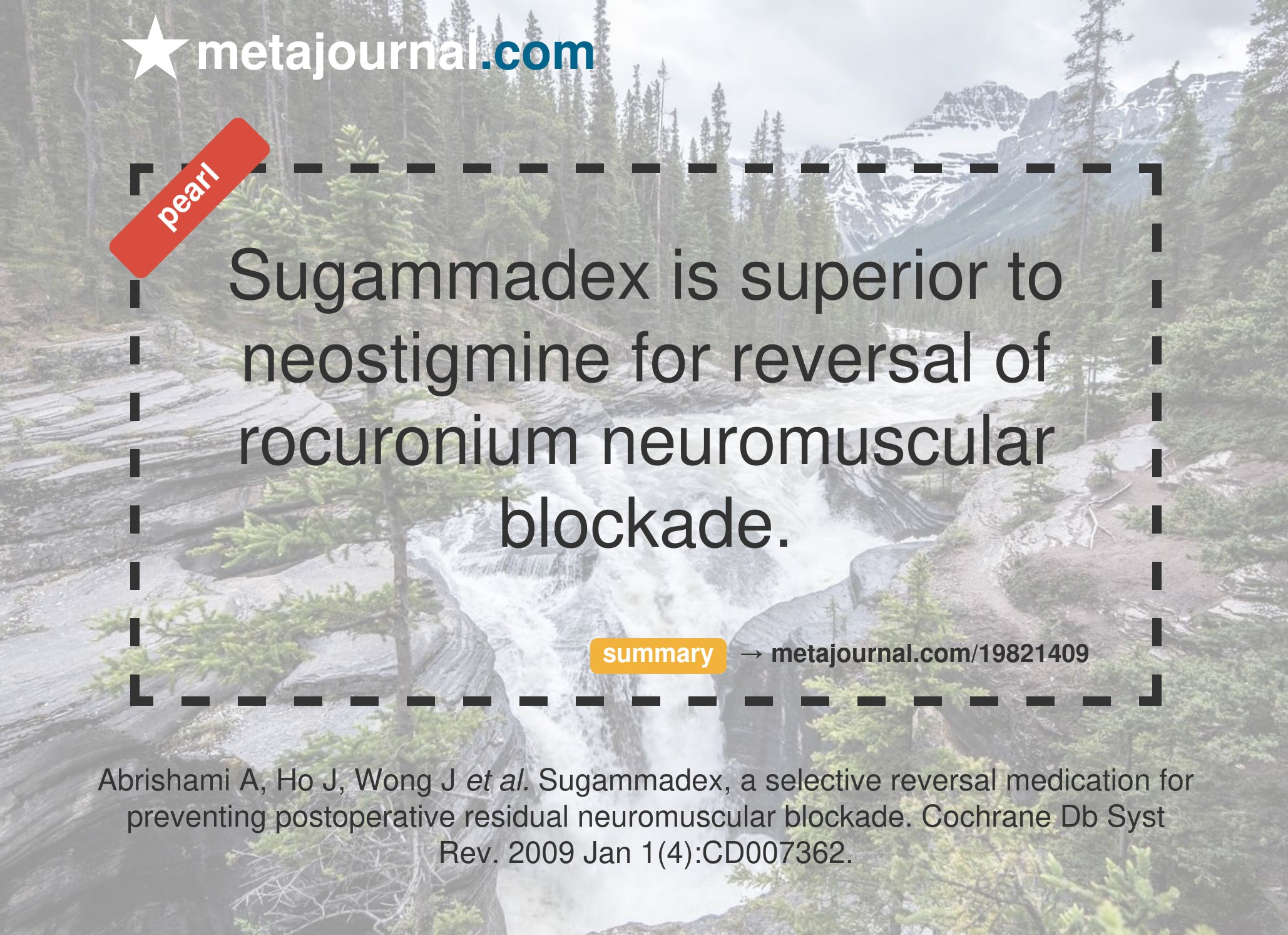 Abrishami et al.'s Cochrane review of 18 RCTs totalling 1,300 patients confirmed the superiority of sugammadex compared with neostigmine at all studied levels of blockade. They identified sugammadex dosing of: