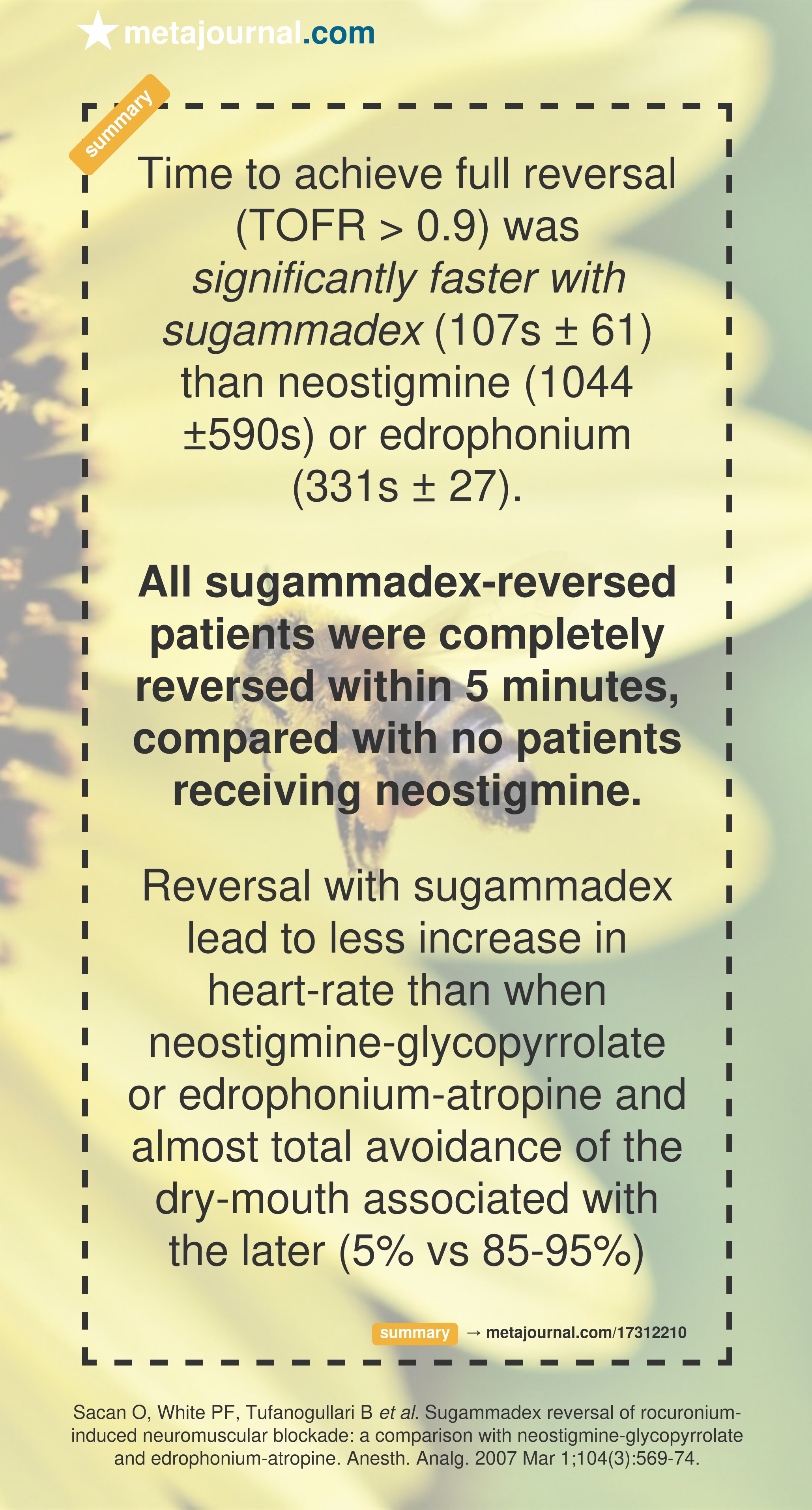 Time to achieve full reversal (TOFR > 0.9) was significantly faster with sugammadex (107s ± 61) than neostigmine (1044 ±590s) or edrophonium (331s ± 27).