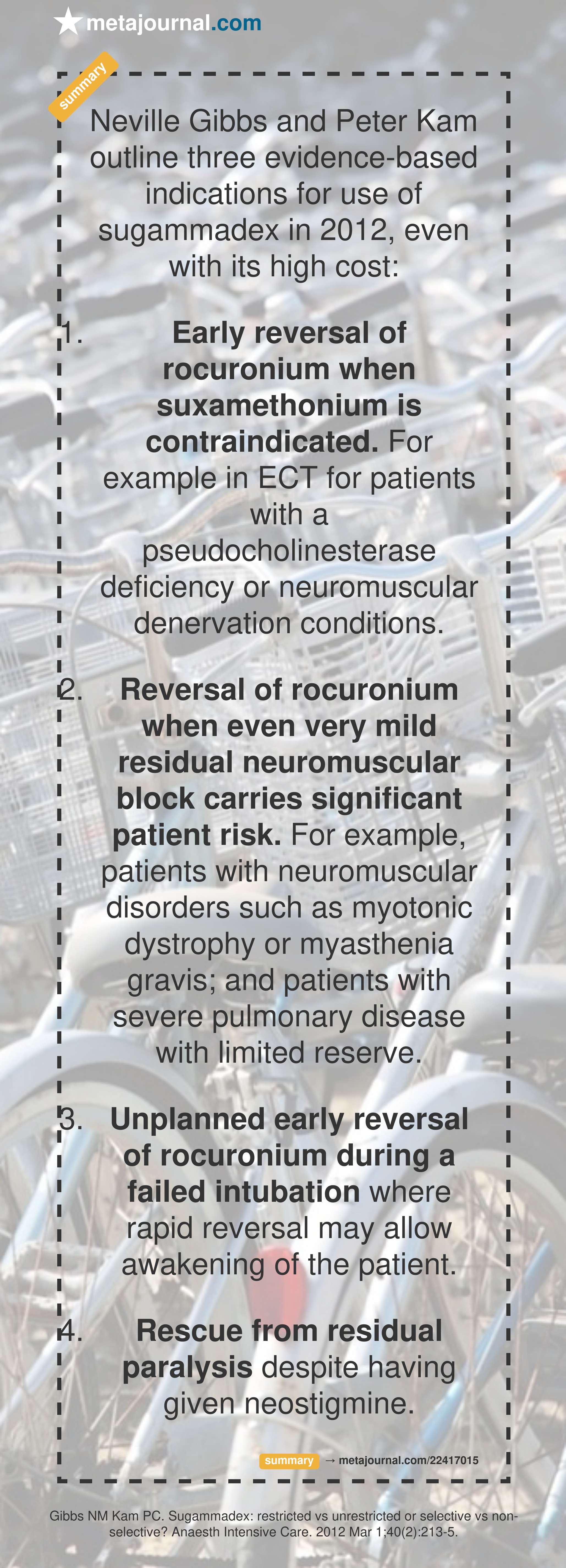 Neville Gibbs and Peter Kam outline three evidence-based indications for use of sugammadex in 2012, even with its high cost: