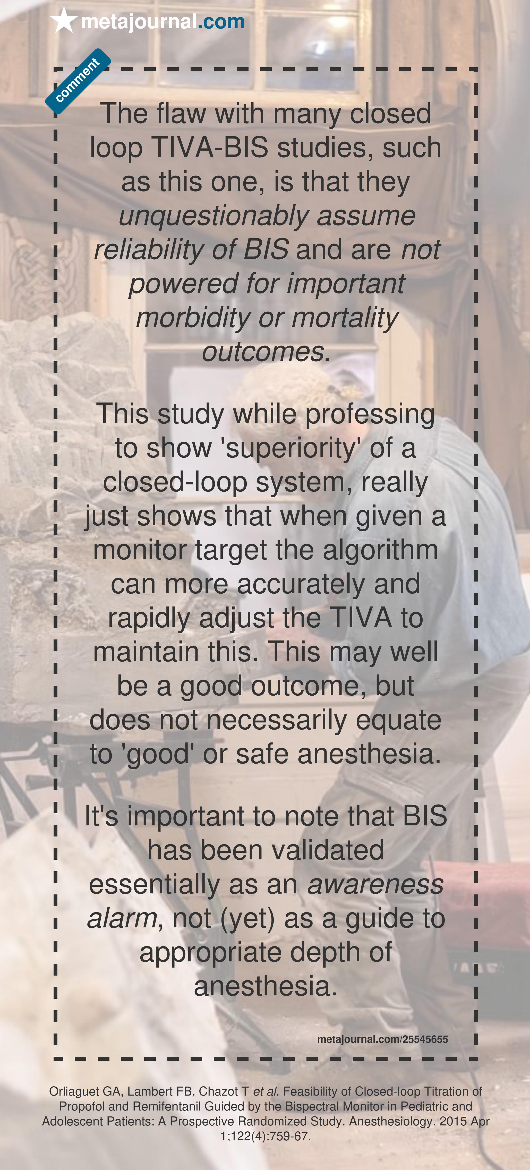 The flaw with many closed loop TIVA-BIS studies, such as this one, is that they unquestionably assume reliability of BIS and are not powered for important morbidity or mortality outcomes.