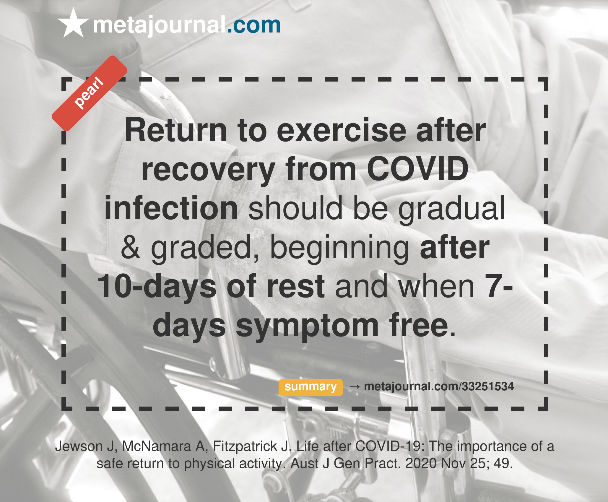 Jewson, McNamara & Fitzpatrick describe a roadmap for return to activity after COVID infection, developed by the Australasian College of Sport and Exercise Physicians.