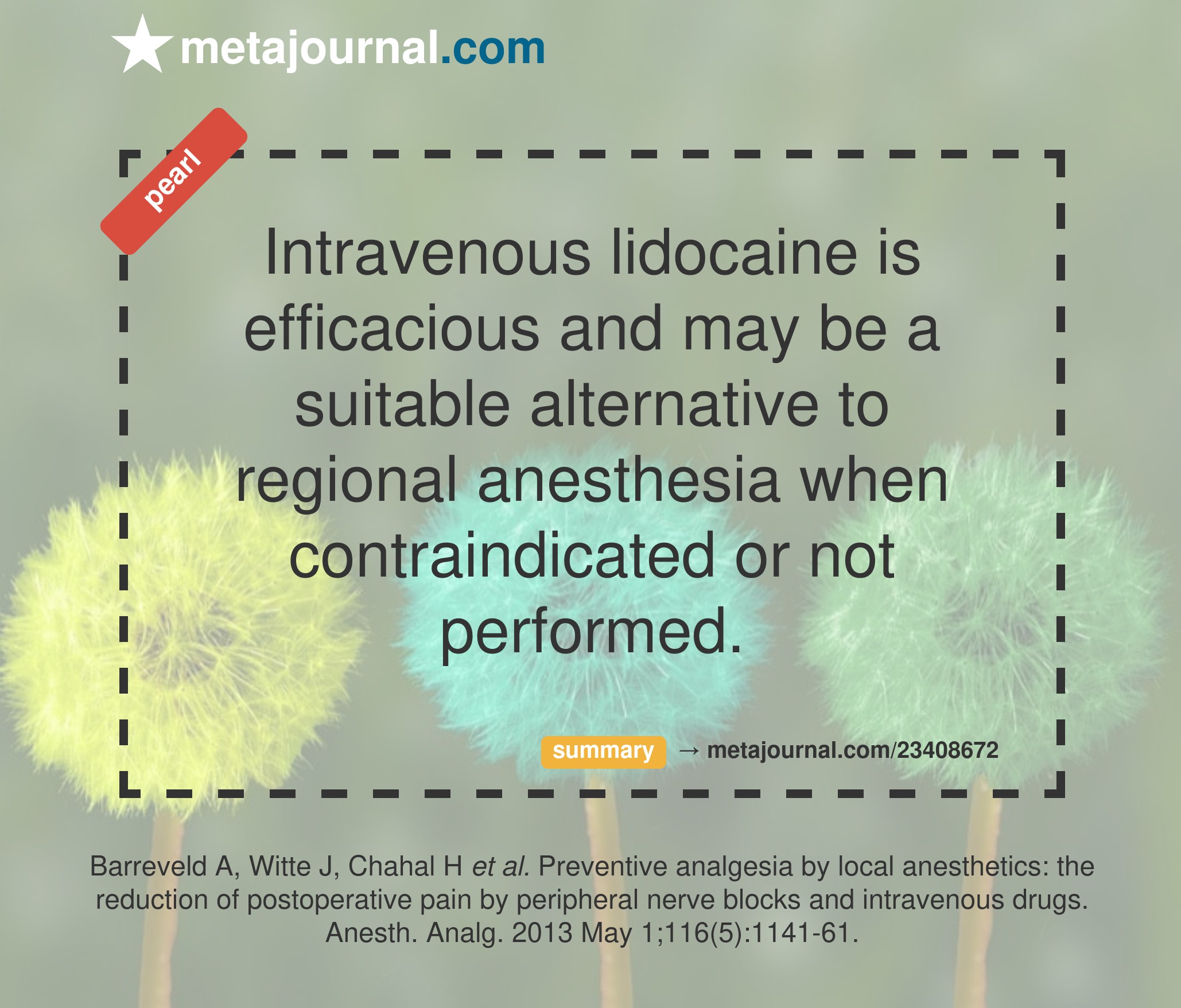 Intravenous lidocaine is efficacious and may be a suitable alternative to regional anesthesia when contraindicated or not performed.