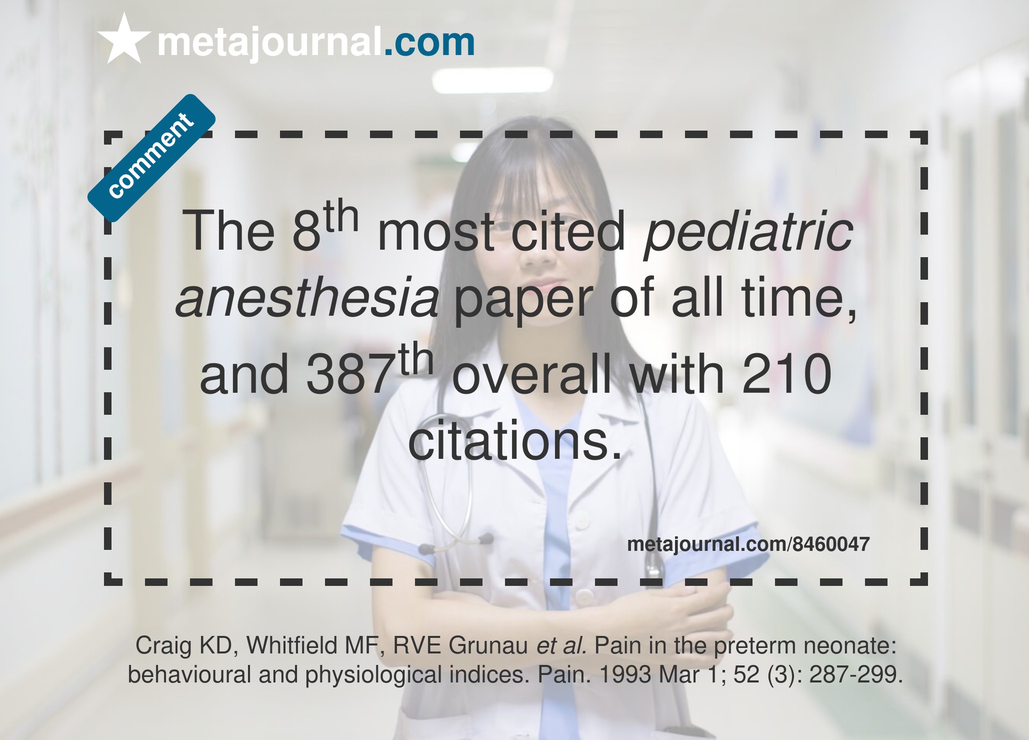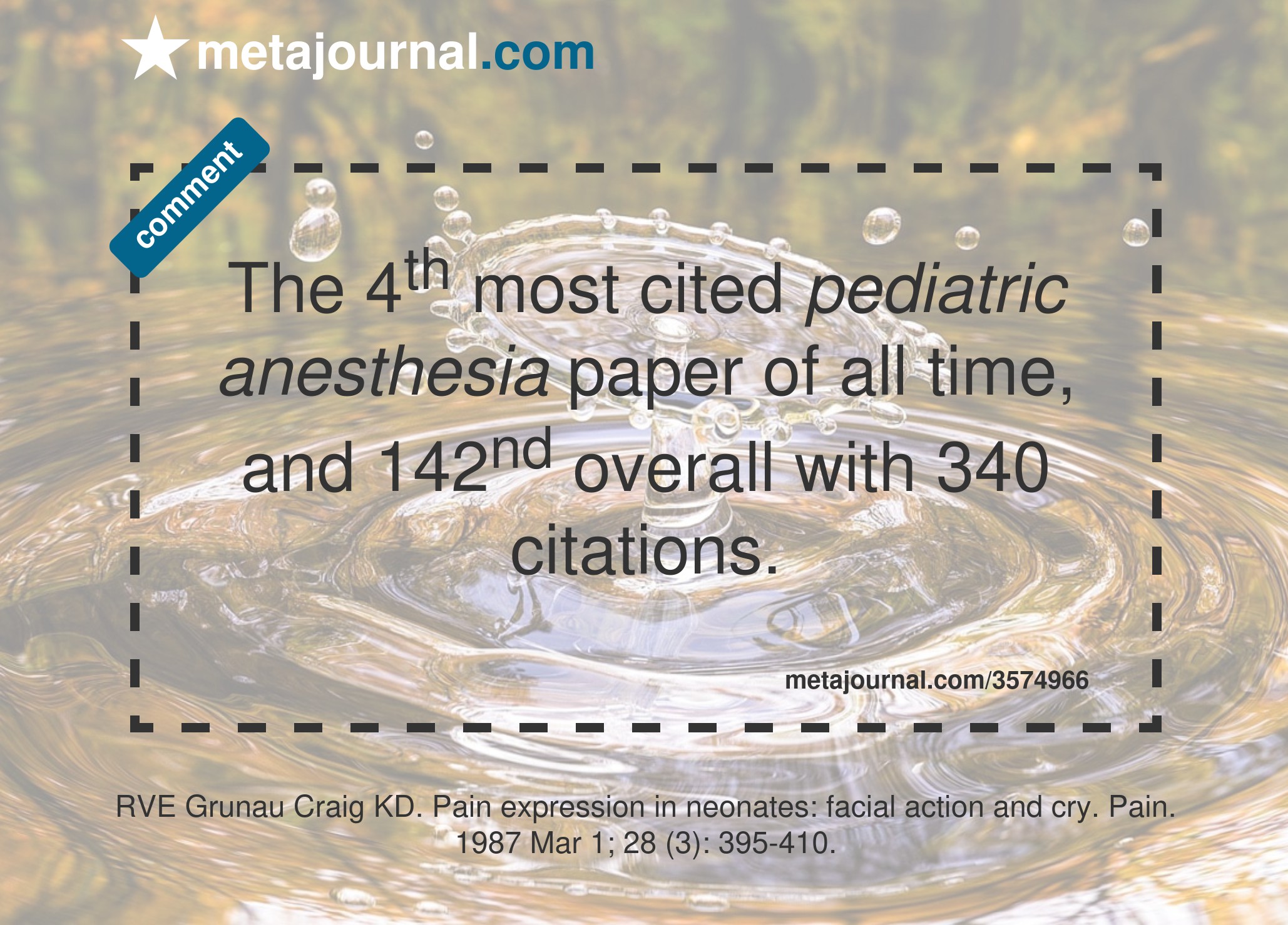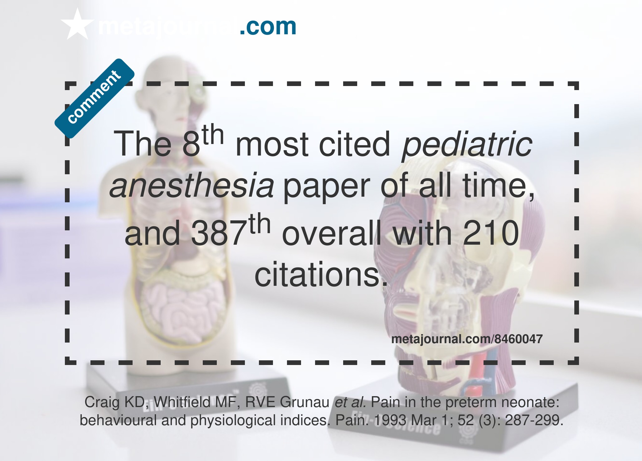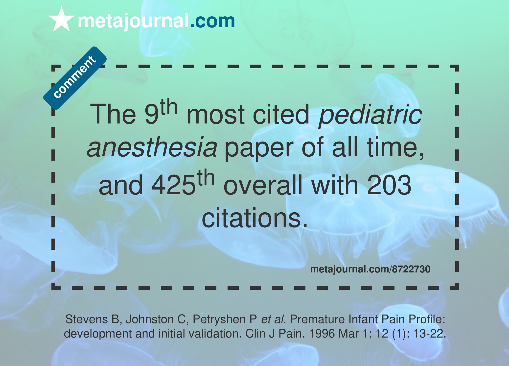 The 8th most cited pediatric anesthesia paper of all time, and 387th overall with 210 citations.